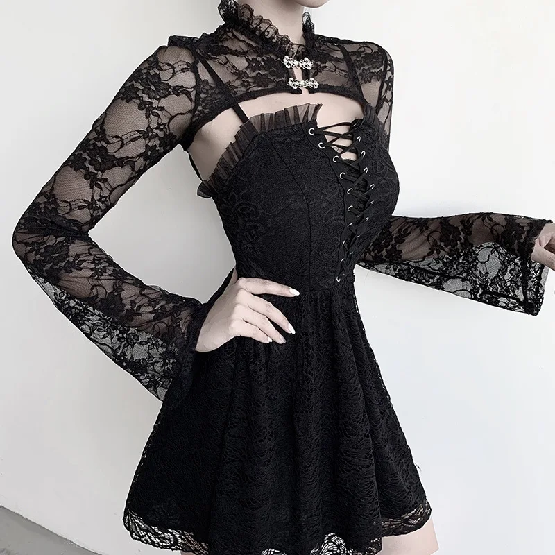 Черная Женская короткая кружевная блузка в стиле панк, 2020, Женская облегающая блузка с расклешенными рукавами, с воротником-стойкой, пикантная Готическая блузка, двубортный топ в стиле рок