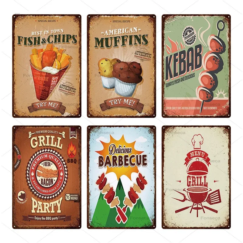 Металлический знак для барбекю, рыбные чипсы, кебаб, кексы, металлическая Жестяная Табличка для шашлыка, бара, паба, кухни, зоны вечерние, декоративные металлические знаки