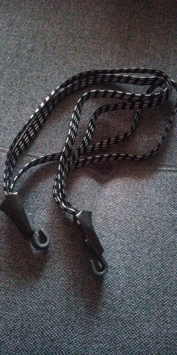 Взял на пробу. Оказалось вполне хорошее крепление. Пластик крючков жесткий, но эластичный, не хрупкий. Качество отливки, правда, не на высоте. Первым делом взял нож и обрезал весь облой. В целом - это единственное неудобство. Сама резинка в меру упругая. Максимальная растяжка - в два раза. Три резинки позволяют достаточно равномерно распределить усилие. 6-ти килограммовый мангал в сложенном виде на багажнике велика держит даже вверх ногами.