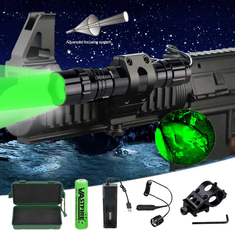 Светодиодный тактический фонарь с регулируемой фокусировкой, охотничий фонасветильник с креплением для прицела винтовки, переключатель, зарядное устройство, чехол, 18650 люмен