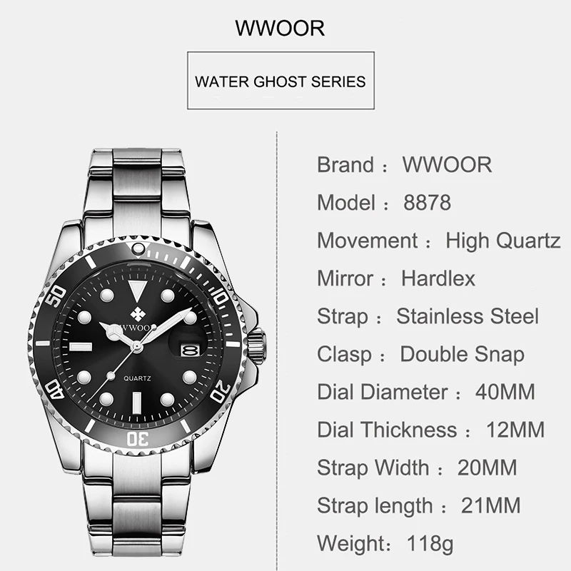 Часы WWOOR мужские Кварцевые водонепроницаемые, брендовые Роскошные Спортивные Светящиеся Наручные, с календарем, для дайвинга, 2021