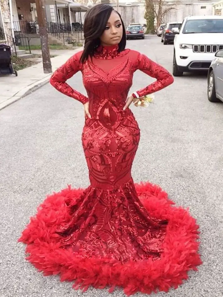 Женское платье для выпускного вечера, красное элегантное бальное платье с длинным рукавом, вечернее платье с юбкой-годе и перьями, одежда для вечеринки