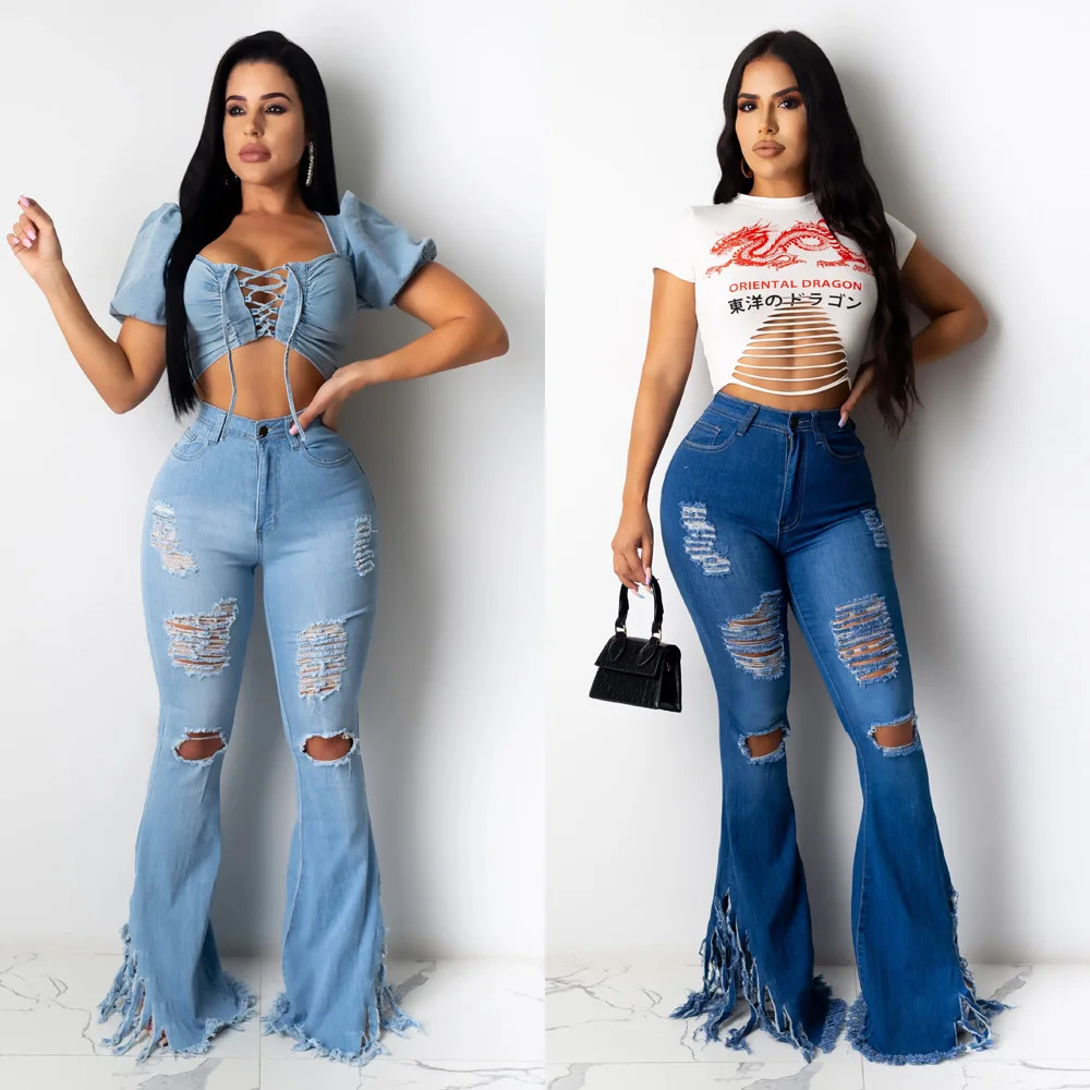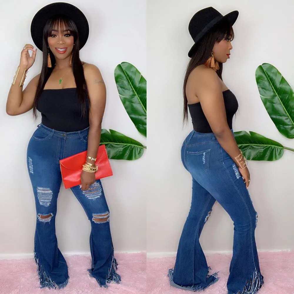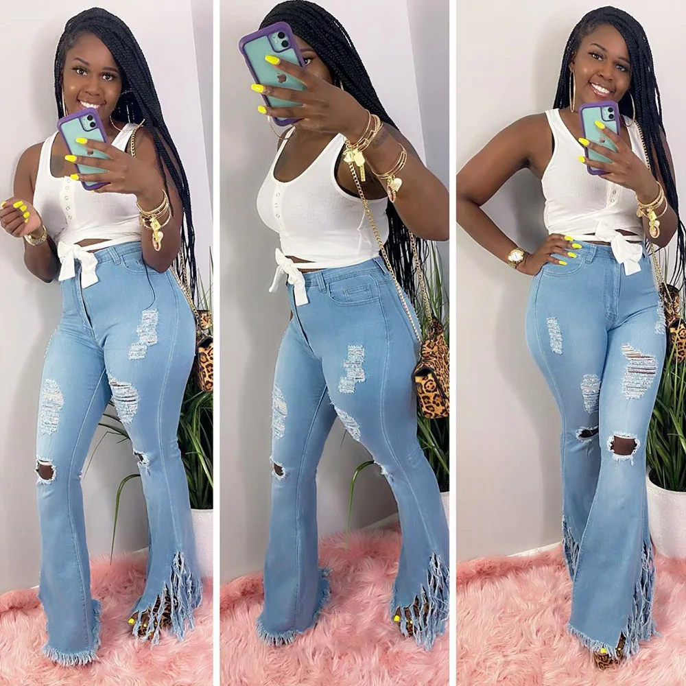 Женские рваные джинсы, расклешенные штаны с кисточками, с высокой талией, голубого цвета icon star icon star icon star icon star icon star