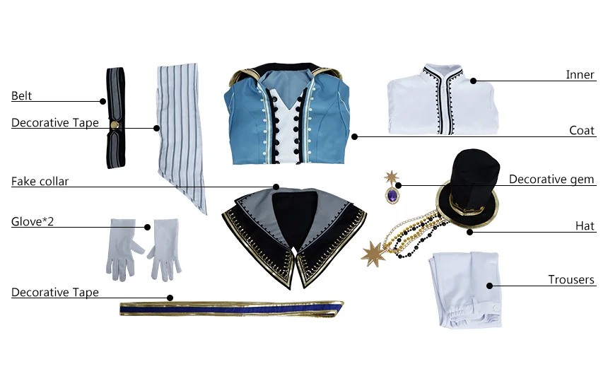 Посылка:Куртка, рубашка, брюки, ткань, пояс, погоны, перчатки * 2, украшение на запястье * 2, украшение звезды.