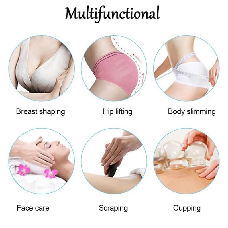 1. Вакуумный насос может поглощать жировые частицы и жидкость, а затем заставить их попасть в грудную ткань и клетки, оставляя грудь более развитой. 2. Экспульсирует токсин и очищает лимфатическую систему, очищает поры кожи, восстанавливает кожу, улучшает микроциркуляцию, повышает эластичность коллагена, поднимает опускающиеся мышцы, противодействует морщинам, активирует кожу, снимите мешочек под глазами и двойную челюсть, устраните морщины и телангиэктаз, а также лечите побочные состояния здоровья. 3. Стимулирует гипофиз к гормону продукта, повышает эластичность и клетчатку мышечной ткани, восстанавливает эластичность и мягкость груди, приподнимает и развивает грудь, улучшает форму груди, улучшает высасывание сосков, стабилизирует эффект лечения. 4. Ускоряет преобразование жирных кислот, безопасно и эффективно удаляет избыточный жир, уменьшает вес, стройнит тело, устраняет избыточный жир на животе, улучшает форму ног, утяжеляет кожу, подходит для скраба, точечная перкуссионная терапия, лимфатическая детоксикация, лечение целлюлита, улучшение ягодиц для осуществления идеального контроля тела.