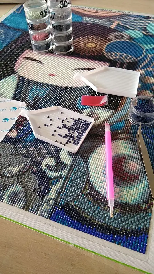 2. Вставьте круглый конец ручки в Дозирующий цемент (нажмите, чтобы сохранить цемент на месте). 3. Используйте круглый конец ручки, чтобы приклеить бриллиант и слегка нажмите, чтобы удалить любой дополнительный цемент. 4. Разорвите частичную пленку и поместите алмаз на холст в соответствии с соответствующим номером. 5. Если вы приклеите алмаз к неправильной области на картине, удалите алмаз пинцетом. 6. После завершения слегка прижмите алмазы рукой или книгой, чтобы убедиться, что алмазы надежно закреплены.