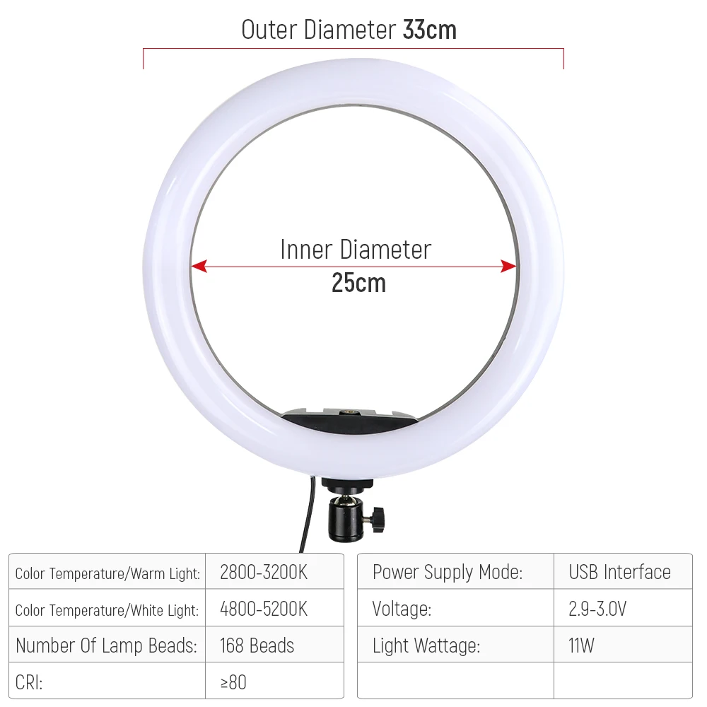Внешний диаметр: 33 смВнутренний диаметр: 25 смЦветовая температура/Теплый светильник: 2800-3200KЦветовая температура/белый светильник: 4800-5200KКоличество лампочек: 168 бусинCRI: 80Режим питания: интерфейс USBНапряжение: 2,9-3,0 VСветильник Мощность: 11 ВтМатериал: АБС-пластик