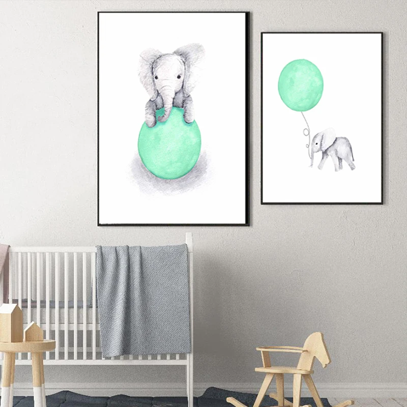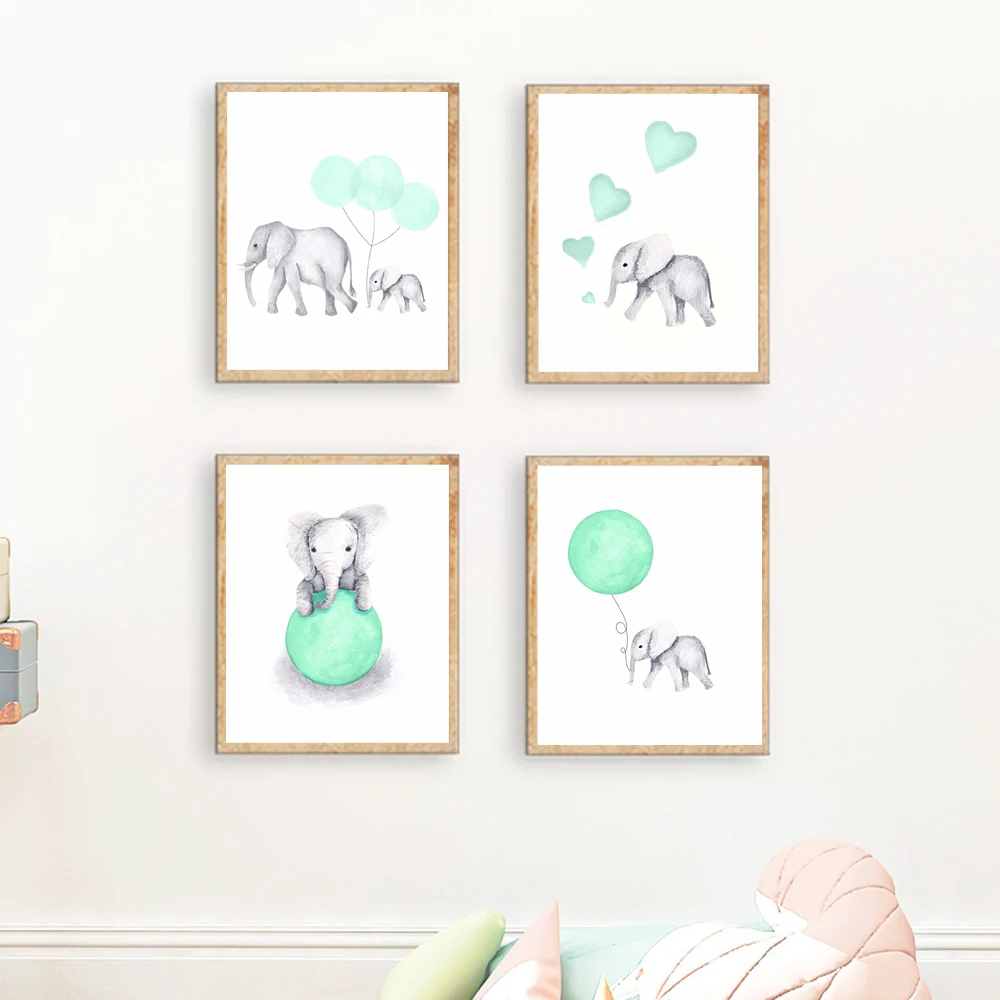 Мультяшный слон, выдувание воздушных шаров, принты, живопись, мята, зеленый воздушный шар, сердце, плакаты, картины, домашний декор для детской комнаты