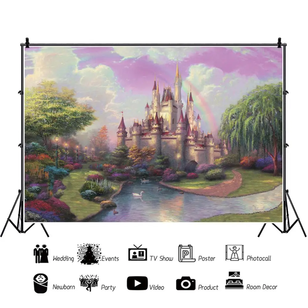 Фото фоны Страна Чудес мечтательный замок Красочный Радуга Лебедь озеро Цветы День Рождения фотографический фон для фотостудии
