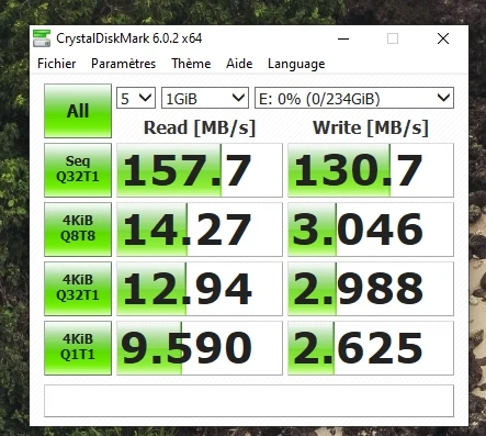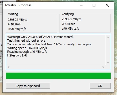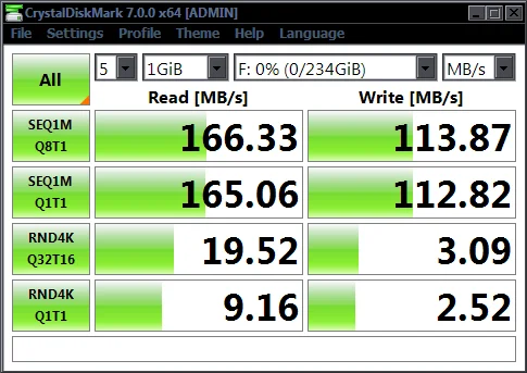 Хорошо. Тест показывает действительно высокую скорость записи, но работает необычно. При написании больших файлов 99% файла появляется после копирования в течение 10-20 секунд, а затем последний 1% занимает 1-2 минуты. Я думаю, что это как-то обманет кристаллический знак. После многих тестов я могу сказать, что скорость записи составляет 20-25 МБ/с./с. Чтение действительно быстрое. В любом случае, это USB 3 скорости, а не 2, так что все хорошо. Написание многих файлов состоит из написания в течение некоторого времени и застревания в течение некоторого времени, но средняя скорость такова, как я сказал. В противном случае никаких проблем пока нет. 234 ГБ, видимый из 256.