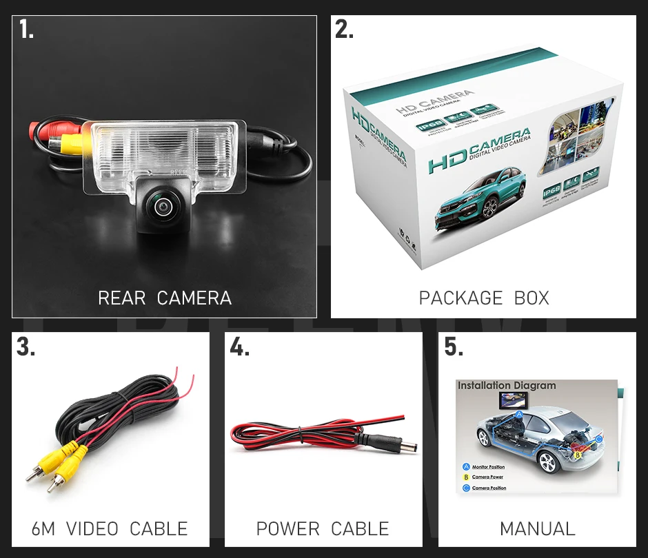1. Задняя камера2. Коробка для посылка3. Видео кабель (6 м)4. Кабель питания5. Руководство пользователя