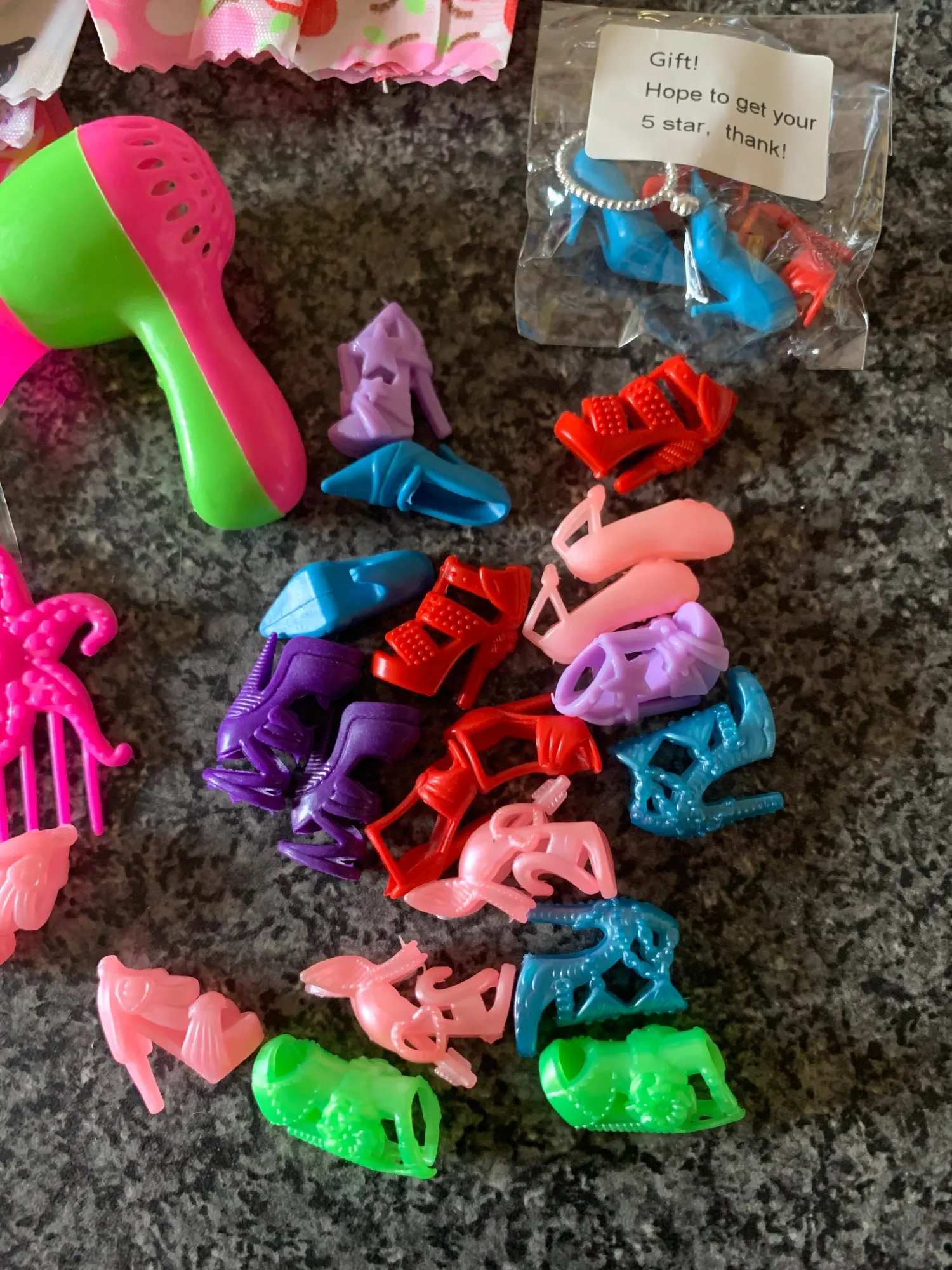 Я купил 2 упаковки одежды Барби у этого продавца. Попросили продавца прислать мне разные наряды, но я все еще получил одни и те же и 99% идентичные на обуви. Но я все еще ставлю продавцу 5 звезд за то, что Он отзывчив. Качество приемлемо для этой цены. Некоторые туфли не подходят для оригинальных Барби стандартного размера. Продавец отправил подарок