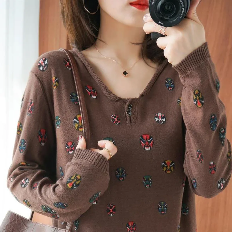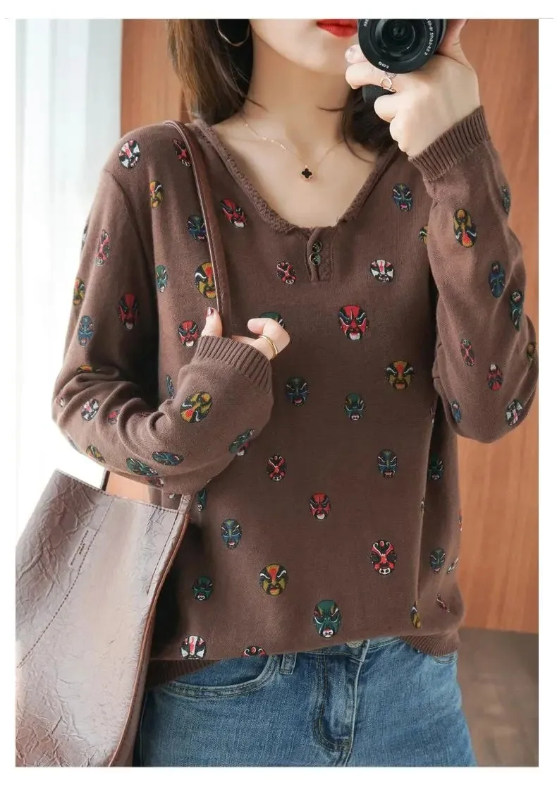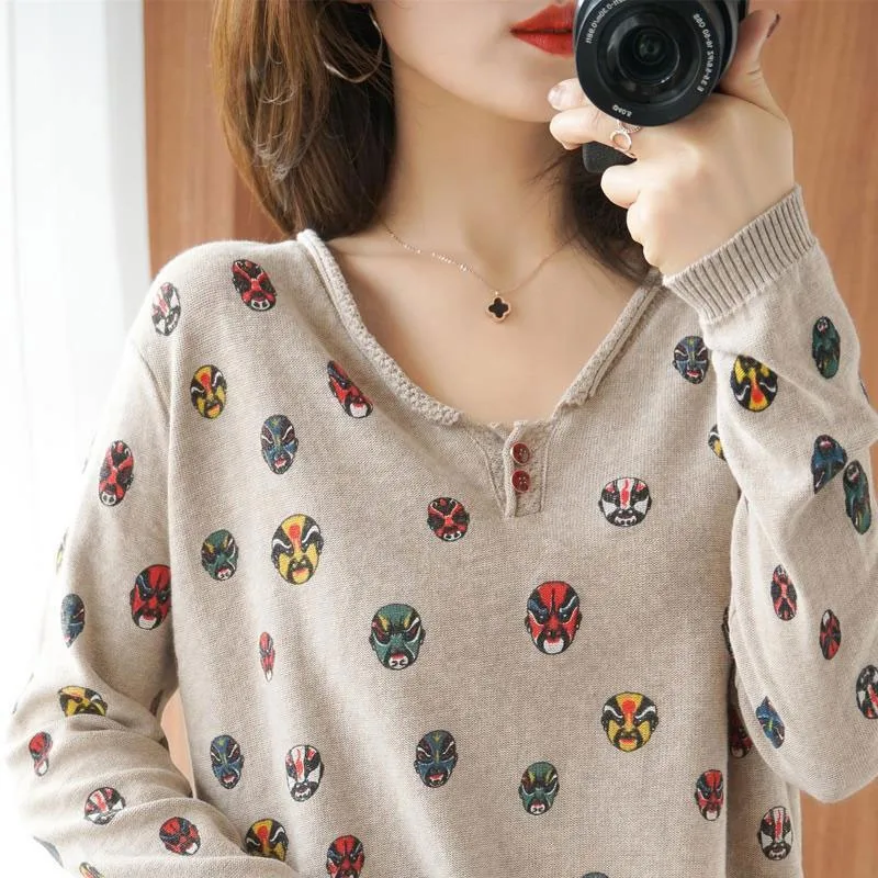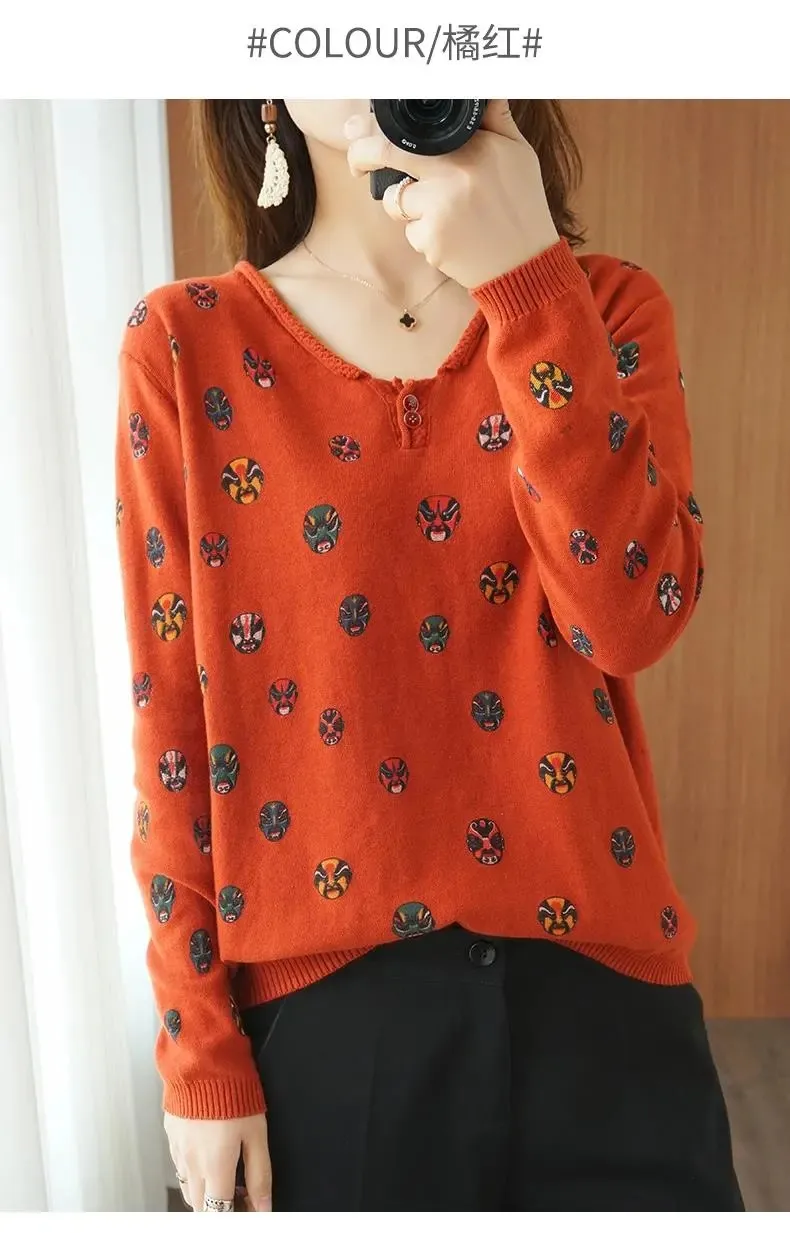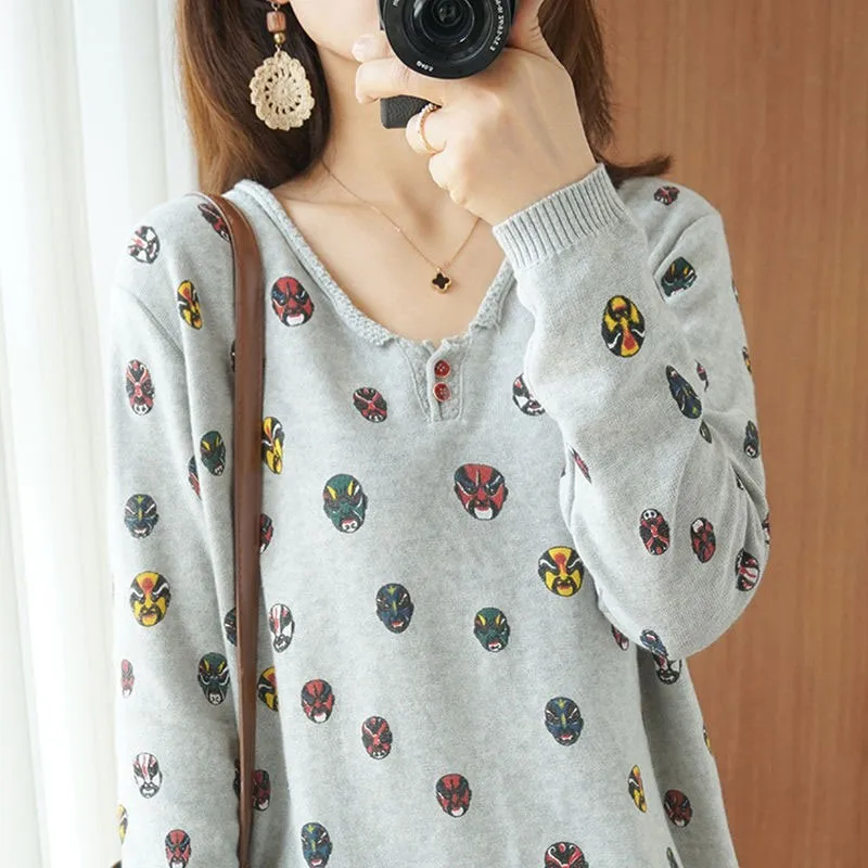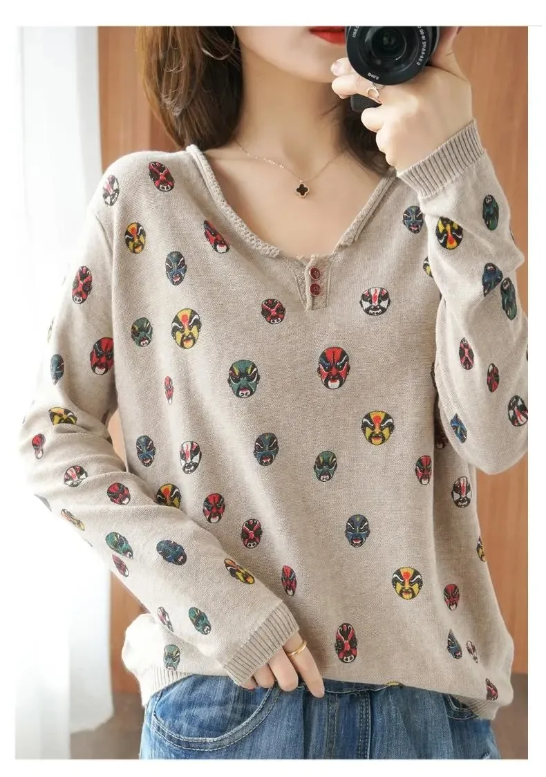 Новинка 2020 весна осень женский свободный пуловер с длинным рукавом и v-образным вырезом винтажный принт Повседневный хлопковый вязаный свитер размера плюс M454