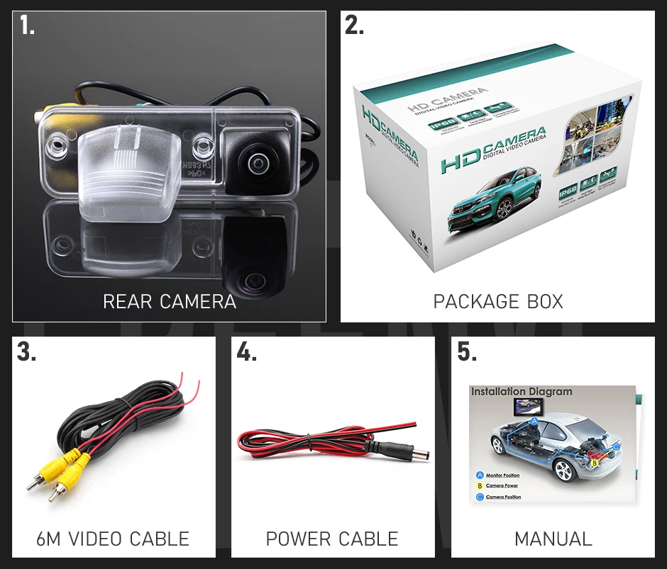 1. Задняя камера2. Коробка для посылка3. Видео кабель (6 м)4. Кабель питания5. Руководство пользователя