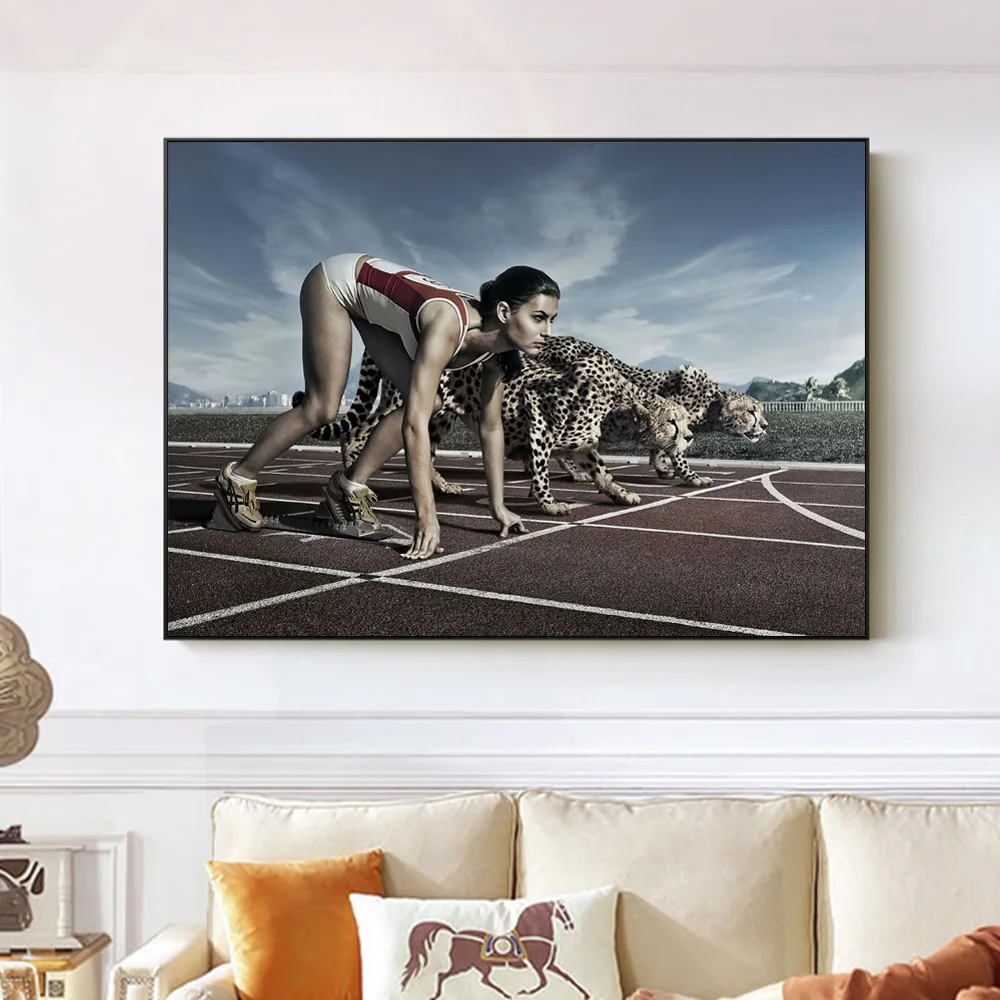 Картина на стену соревнование спортсменов с гепардом, постеры и принты на холсте с животными для украшения гостиной