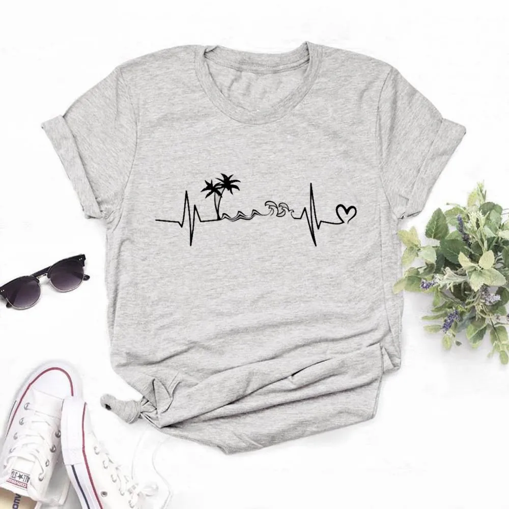 Женская футболка с принтом Harajuk, летняя модная футболка с коротким рукавом, с изображением кокосовой пальмы, волн, сердца, 2020