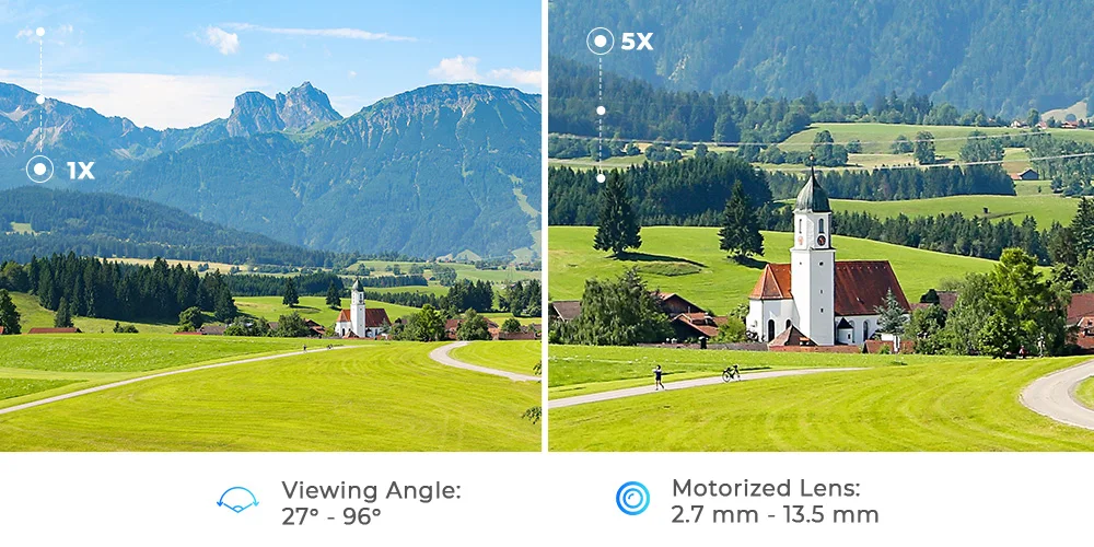 Его моторизованный варифокальный объектив обеспечивает угол обзора 27 ° ~ 96 °, а его 5X оптический зум позволяет увеличивать масштаб для удивительных деталей или уменьшать масштаб для максимального покрытия.