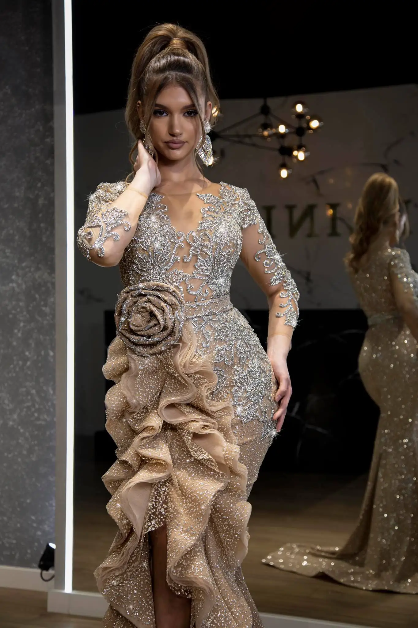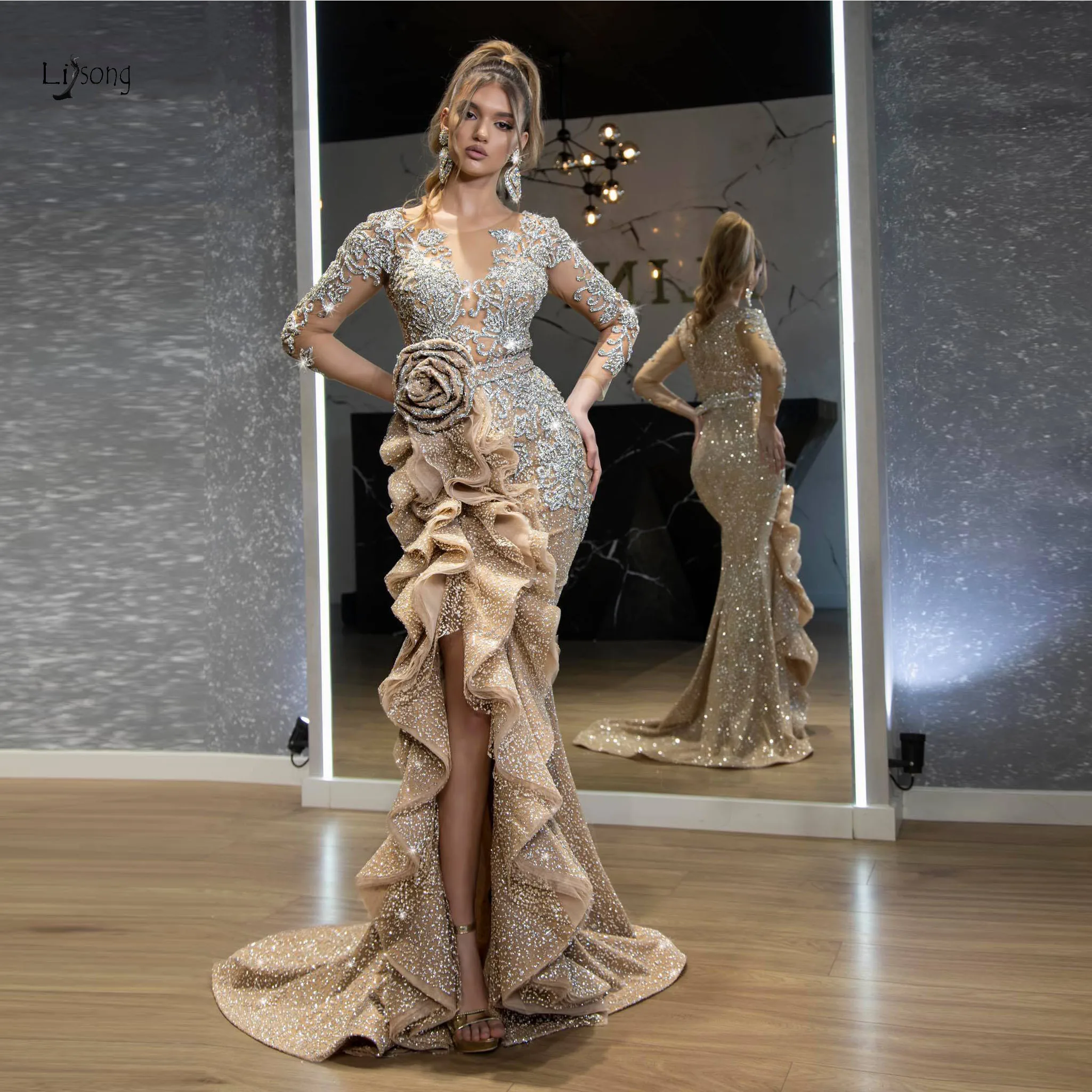 Блестящие Длинные вечерние платья цвета шампанского, с разрезом, Со стразы, с бисером, для выпускного вечера, с длинными рукавами, с блестками, вечерние платья с оборками