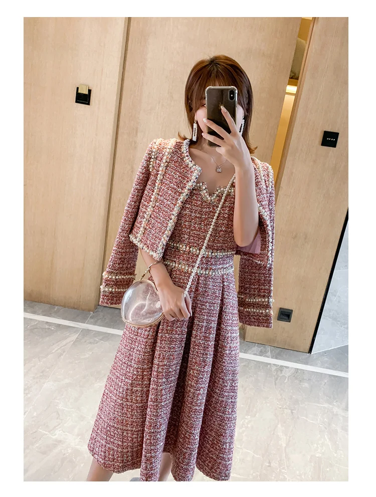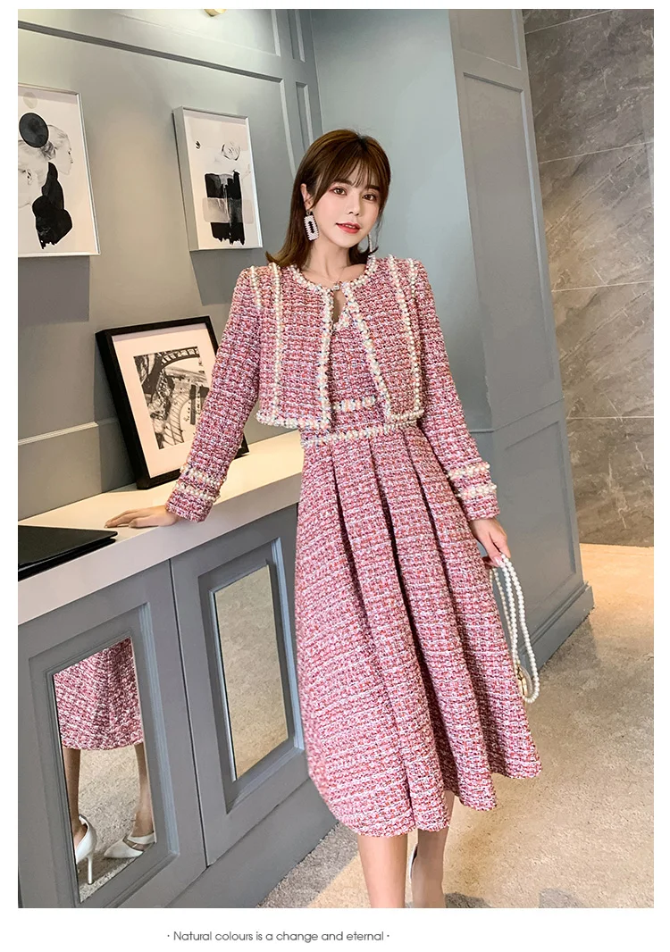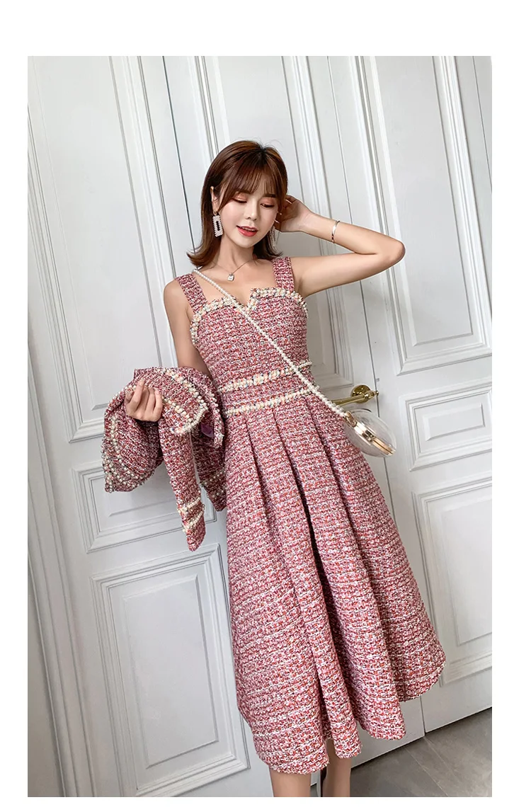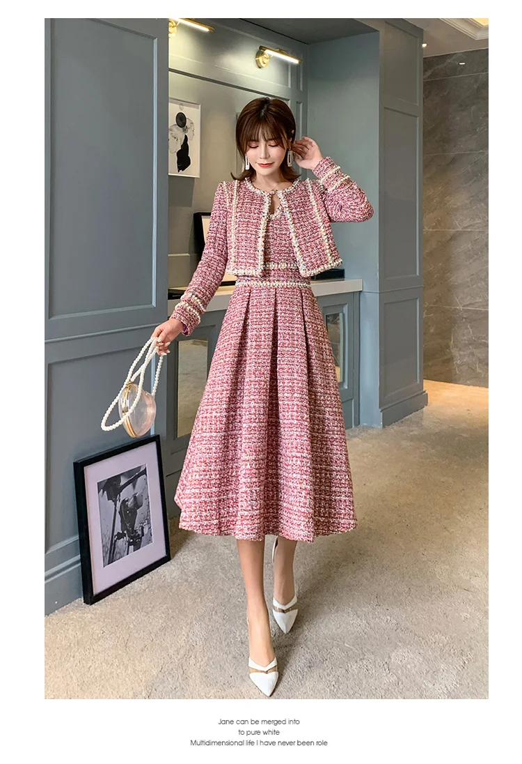 Женский твидовый костюм JSXDHK, розовая короткая шерстяная куртка с бахромой и жилетом, бальный костюм миди из двух предметов на осень и зиму