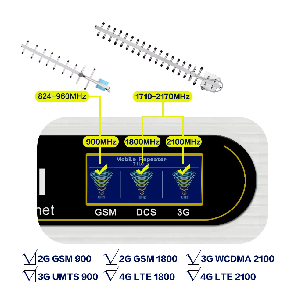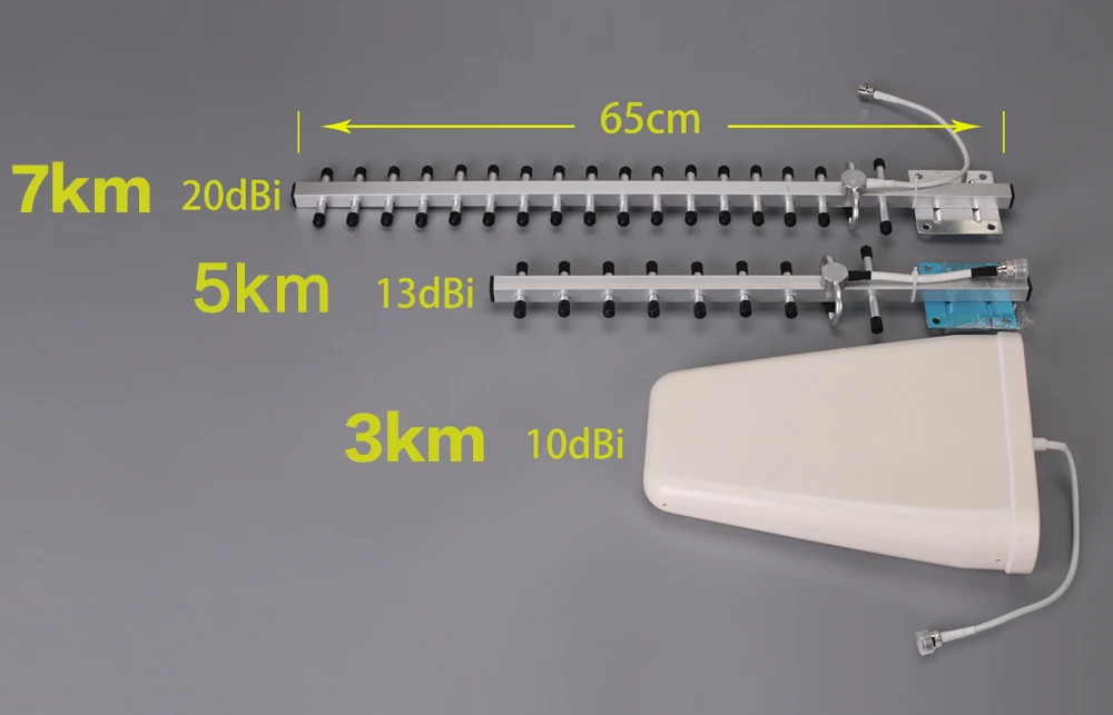 Антенна DCS/WCDMA Yagi: 1710-2170 МГц Сетевая антенна огромна; Макс. Диапазон приема антенны около 7 км. GSM антенна Yagi: 824-960 МГц Антенна yagi составляет 12 дБи, максимальная дальность приема составляет около 5 км.