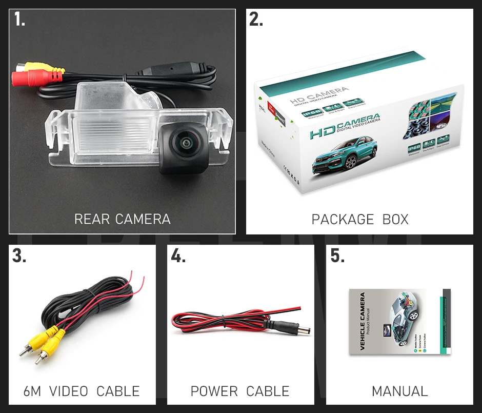1. Задняя камера2. Коробка для посылка3. Видео кабель (6 м)4. Кабель питания5. Руководство пользователя