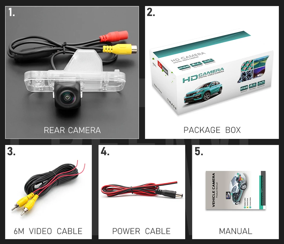 1. Задняя камера2. Коробка для посылка3. Видео кабель (6 м)4. Кабель питания5. Руководство пользователя