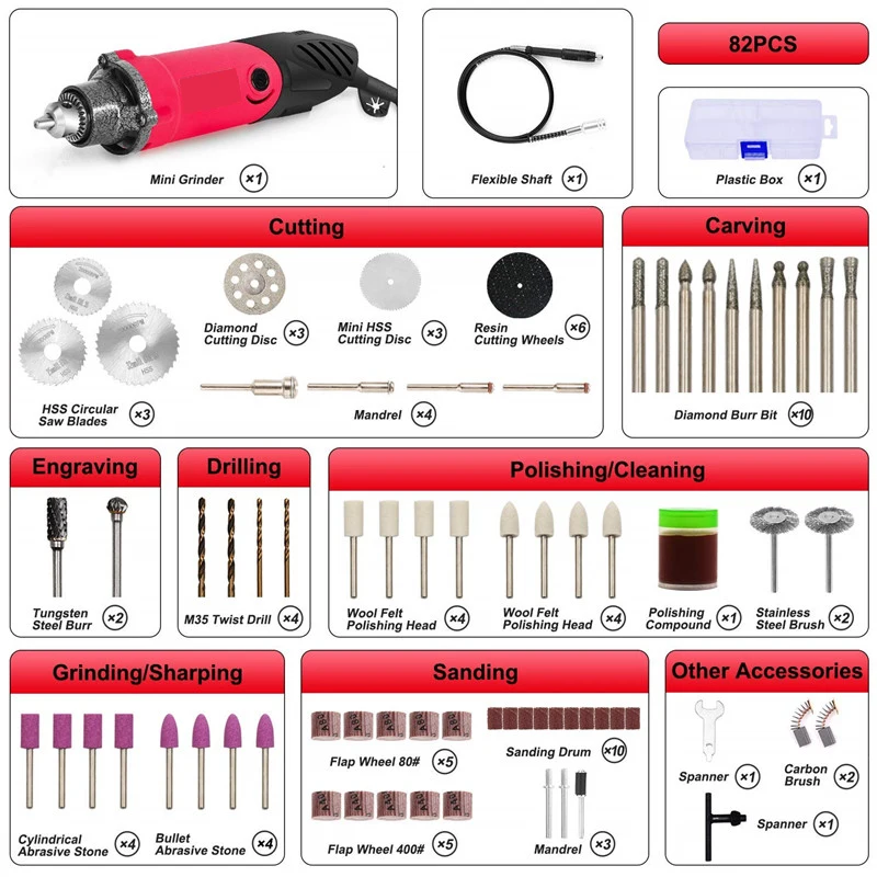 Особенности:【Мощный вращающийся инструмент 】: роторный инструмент поставляется с высокопроизводительным двигателем из чистой меди мощностью 500 Вт, который обладает высокой мощностью и может позволить себе сверхпрочную работу, значительно повысить эффективность работы; А универсальный 3-кулачковый патрон 0,6-6,5 мм обеспечивает стабильность и устойчивость крепления самого дикого размера. 【Переменная скорость Drill】: 6-ступенчатая скорость от 35000 об/мин позволяет регулировать скорость для различных целей, низкая скорость для очистки приложений и использования щеточных принадлежностей или высокой скорости для маршрутизации, резка и шлифовка для обеспечения максимального контроля и точности. Эта мини-шлифовальная машина идеально подходит для широкого спектра применений, таких как резка, гравировка, обрезка, полировка, переработка, сверление или разглаживание деталей, для любой работы по улучшению или производству. 【Многоцелевой набор шлифовальных станков 】: подходит для проектов «сделай сам» в вашем доме, работы в гараже, хобби, ремесло, ювелирные изделия, ювелирные инструменты и оборудование, изготовление узоров, деревообработка, металлообработка и многое другое. [Усовершенствованный гибкий вал]: крепление гибкого привода имеет высокую концентричность, отлично подходит для точных и детальных работ в ограниченном пространстве или труднодоступных местах, также хорошо уменьшает вибрацию в руках и защищает электродрель от пыли, стружки. Пожалуйста, держите гибкий вал как можно прямой, чтобы продлить срок службы. 【Rich многофункциональные аксессуары 】: все Аксессуары поставляются с этим роторным инструментом высокой производительности, которые могут удовлетворить ваши различные потребности, предоставить больше возможностей для работы, и это возможно для применения в любом проекте. Качественные аксессуары, особенно для быстрорежущей роторной шлифовальной машины, обеспечивают шлифовку, полировку, сверление, резку и т. д. все функции могут быть реализованы. Спецификация:Материал: сплав + АБС-пластик Напряжение: 110 В Мощность: 500 Вт Частота: 60 Гц Скорость холостого хода: 35000 об/мин Диаметр патрона: 0,6-6,5 мм Цвет: красный Размер: 270*55 мм Комплектация:1 х шлифовальный станок 1 х гибкий вал 1 х ключ патрона 1 х полировальная смесь 1 х мини-ключ 1 х пластиковая коробка 2 × вольфрамовые заусенцы 2 х проволочная щетка 2 × Угольная щетка 3 × диск для пилы 3 × алмазный режущий диск 3 × отрезной диск из стали HSS 4 × M35 спиральная дрель 6 × фетровое полировальное колесо 6 × диск для резки смолы (черный) 7 × хвостовик 8 × абразивный камень 10 х откидное колесо 10 × Алмазный заусенец 10 × шлифовальный барабан Примечание:1. Возможны отклонения в 1-3 см (0,4-1,18 дюйма) из-за ручного измерения и небольшие различия в цвете из-за различных настроек дисплея. 2. Из-за разницы светильник щении и экранах цвет изделия может немного отличаться от изображения. Пожалуйста, поймите.