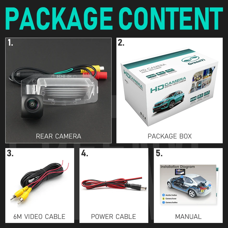 1. Задняя камера2. Коробка для посылка3. Видео кабель (6 м)4. Кабель питания5. Руководство пользователя