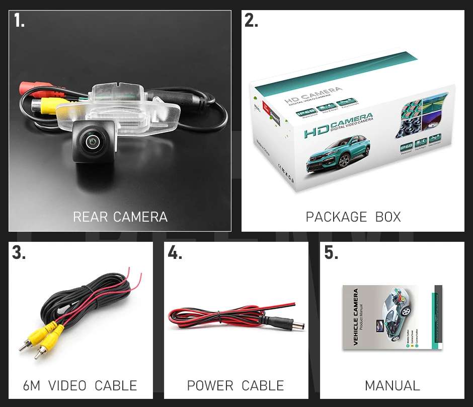 1. Задняя камера2. Коробка для посылка3. Видео кабель (6 м)4. Кабель питания5. Руководство пользователя