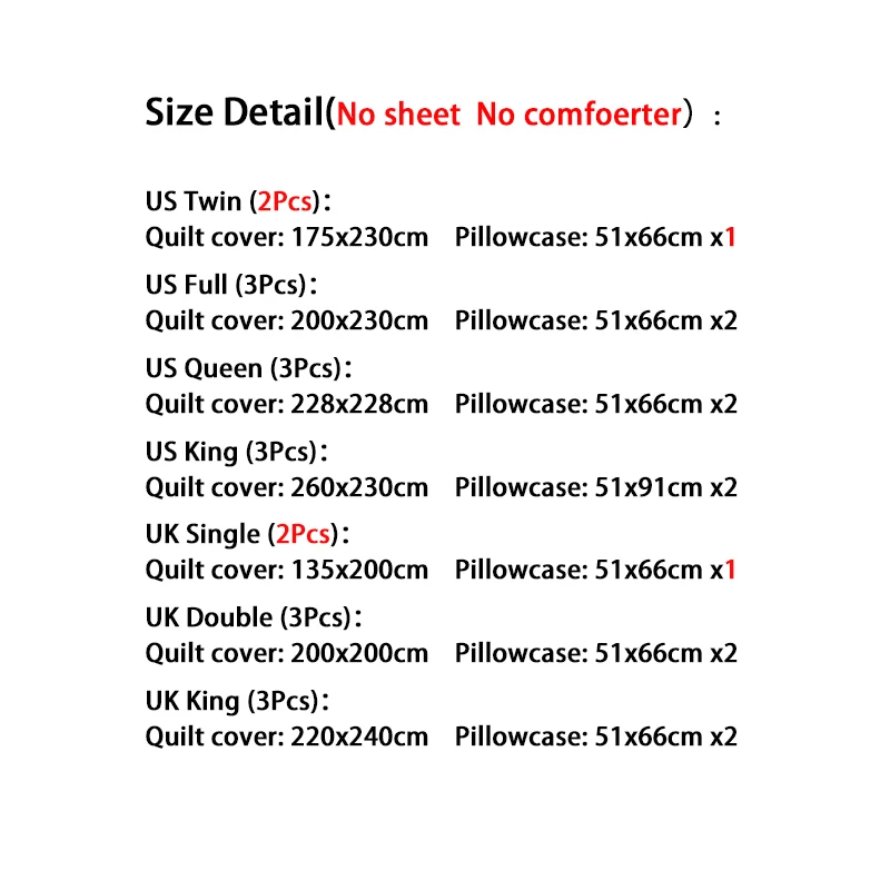 US Twin (2 шт.): пододеяльник: 175x230 см, наволочка: 51x66 см x1 Полный комплект США (3 шт.): пододеяльник: 200x230 см, наволочка: 51x66 см x2 Королева США (3 шт.): пододеяльник: 228x228 см, наволочка: 51x66 см x2 Король США (3 шт.): пододеяльник: 260x230 см, наволочка: 51x91 см x2 UK Single (2 шт.): пододеяльник: 135x200 см, наволочка: 51x66 см x1 UK Double (3 шт.): пододеяльник: 200x200 см, наволочка: 51x66 см x2 UK King (3 шт.): пододеяльник: 220x240 см, наволочка: 51x66 см x2