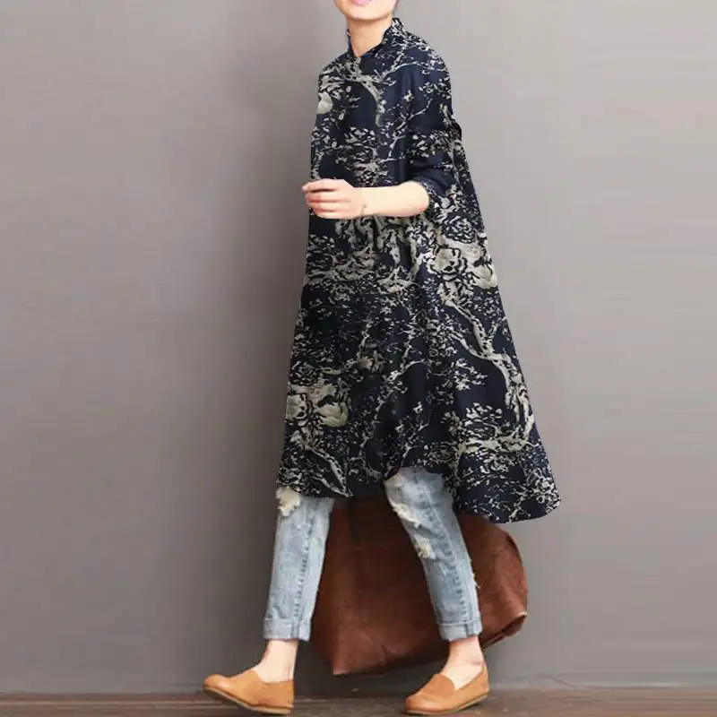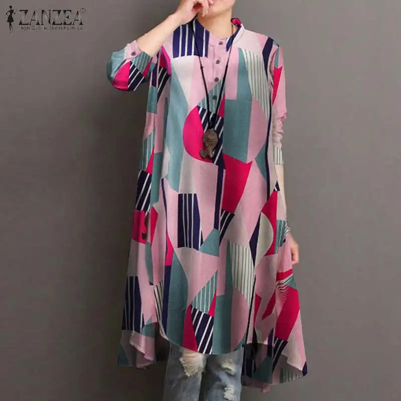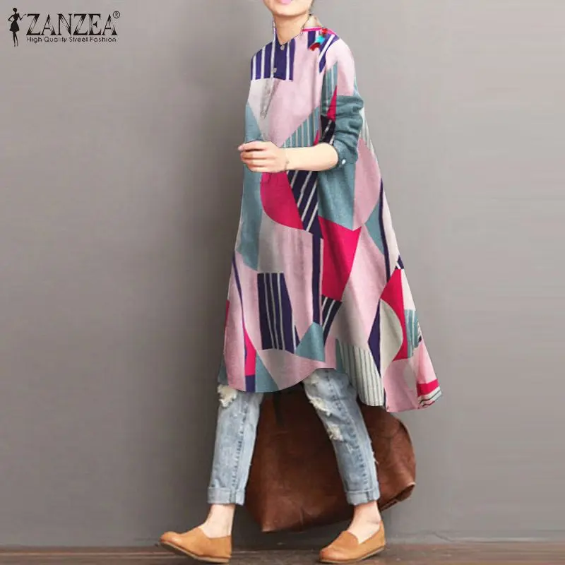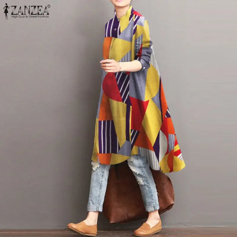 Блузка ZANZEA Женская Асимметричная с принтом, длинная рубашка с длинным рукавом, повседневный топ на пуговицах, в стиле оверсайз, на осень