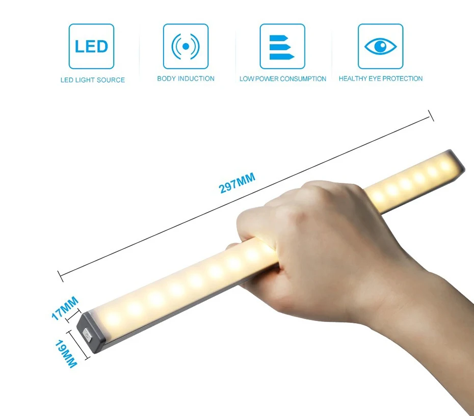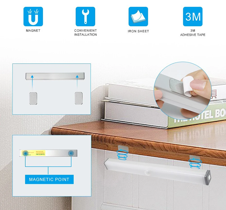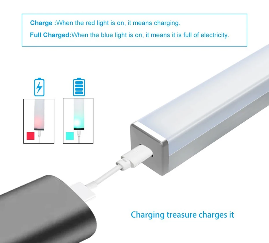 Аккуратная лампа на все случаи жизни. Мы покупали в шкаф. Подзарядка от USB (кабель в комплекте). Алюминевая основа, которая магнитится. В комплекте идут также две липучки с металлической основой, чтобы можно было прикрепить и в шкафу - посмотрим, сколько они продержатся в вертикальном положении. Можно настроить кнопкой включения режим: чтобы горела постоянно, реагировала на движение или выключить совсем.