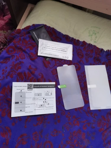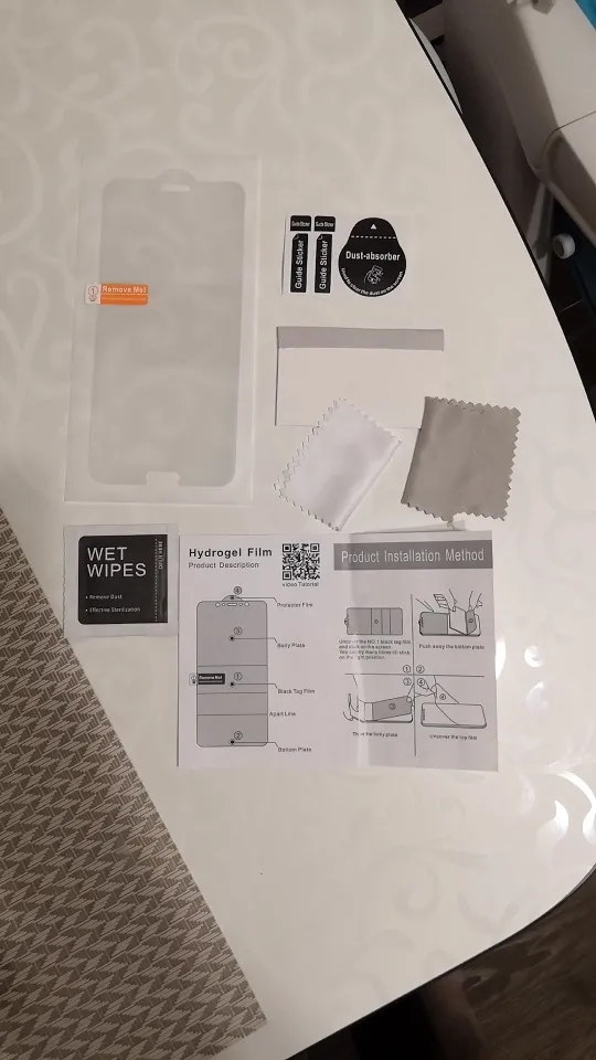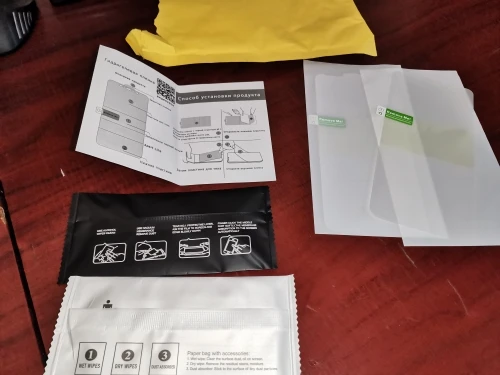 Плёнка прикольная, наклеет любой человек. Есть инструкция на бумаге и на видео. 3 вида салфеток: влажная, протирочная и от микропыли(думал наклейки какие-то). Получилось наклеить с 1го раза. В комплекте 2 плёнки и два комплекта салфеток. Сначала открывайте тот комплект в котором кортонка( похожа на кредитку) почувствуете. Второй точно такой же, только без картонки.