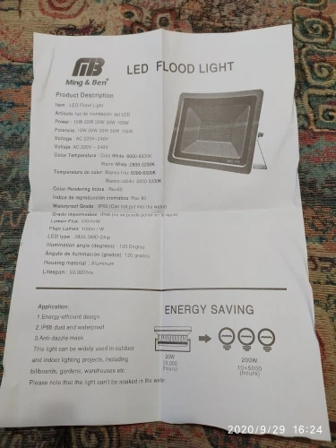 Я прибываю в вашу дату или перед расписанием, прибываю очень хорошо упакованы и алкоголиками, от продавца, чтобы избежать шока Описание продукта очень exata, без датчика движения, хорошее качество тройного кабеля, кристалл, я не знаю, какая толщина, но он выглядит жестким, и с 30 Вт он загорается довольно хорошо. Очень доволен товаром, который я рекомендую.