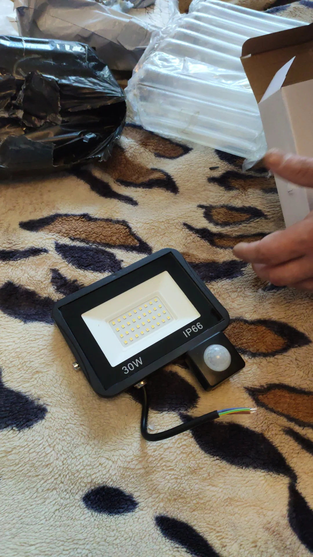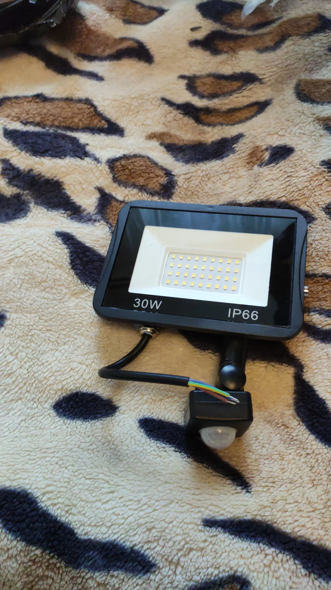 Классный прожектор для дачного участка. Светодиодный светильник выбрали с датчиком слежения. Также имеются характеристики 30w, цвет холодный белый. Посылка пришла очень быстро, заказ полностью отслеживался, доставку выбрали из Китая. Качество отличное, свет достаточно яркий. Светильник может также устанавливаться на подставку.