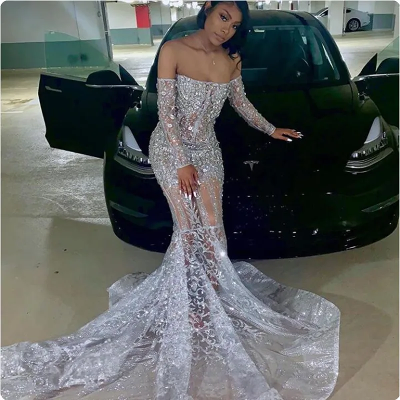 2020 роскошные вышитые бисером Стразы длинные серебряные сексуальные прозрачные вечерние платья русалки с открытыми плечами и длинным рукавом