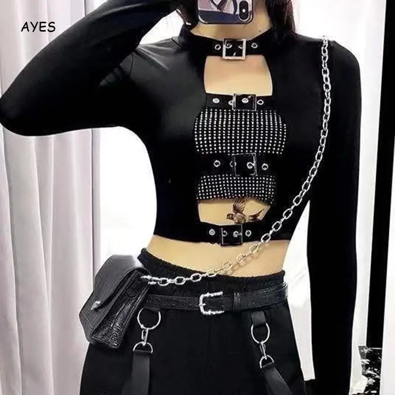 Женские топы для ночного клуба, футболка с пряжкой, сексуальные готические футболки с вырезами, черный короткий топ с длинным рукавом, крутая футболка, уличная одежда