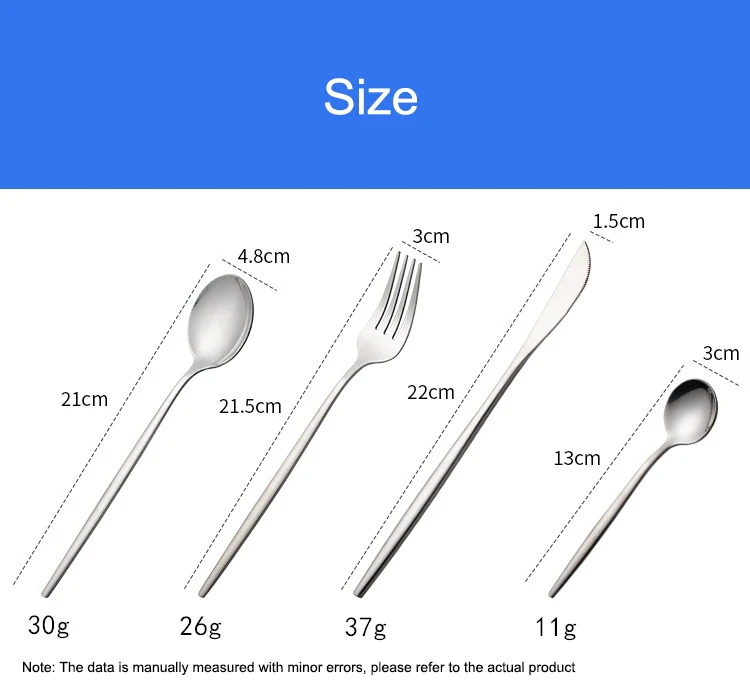 Информация о продукте Изготовлено из высококачественного материала из нержавеющей стали, посуда прочная и прочная, не ржавеет. Простота в использовании и чистоте-Безопасная Посудомоечная машина; Подходит для использования дома, вечерние, в отеле, в ресторане, в подарок, на день рождения, в кемпинге. Мы всегда здесь, чтобы помочь, не стесняйтесь обращаться по электронной почте или по любым вопросам или проблемам. О размере 1 × длина ножа: 22 см/40 г 1 × длина ложки: 21 см/40 г 1 ×Dinner вилка Длина: 21,5 см/30 г 1 × длина чайной ложки: 13 см/10 г О чистке Используйте нейтральное моющее средство, чтобы промыть его, пожалуйста, никогда не используйте сильные щелочные или сильные Окисляющие химические вещества, мойте их. После очистки столовых приборов, пожалуйста, сделайте их сухими и держите столовую посуду чистой и сухой. О товарах Если у вас есть какие-либо проблемы с вашей покупкой, пожалуйста, напишите нам, и мы ответим своевременно. После получения товаров, если у вас есть какие-либо проблемы, свяжитесь с нами, и мы решим вашу проблему. Об использовании В посуда подходят для всей семьи, вечерние, пикников на открытом воздухе, походов, поездок и использования в офисе, а также отличный подарок для вашей семьи и друзей. Примечания Из-за разницы между различными мониторами изображения могут не отражать фактический цвет изделия. Сравните размеры деталей с вашими, пожалуйста, учтите небольшую разницу из-за ручного измерения.