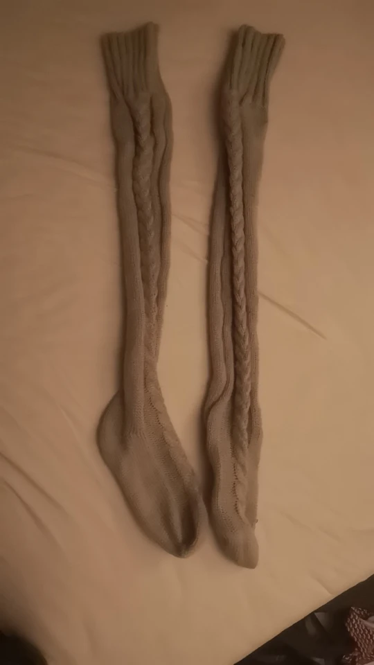 Love these high socks!! They arrived quickly, I bought the charcoal grey ones. Wouldn't recommend for people with thicker thighs sadly :'( I have thick thighs and they don't stretch up, they cling to your leg though and do stay up. Not elasticated. Very warm, I love them.