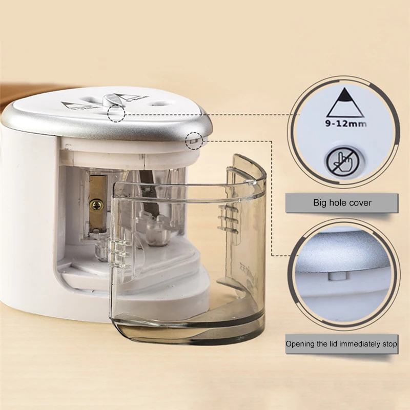 Конструкция с двойным отверстием, электрическая точилка для карандашей, сверхмощная, имеет 2 отверстия разного размера, подходит для карандаша 6-12 мм разных размеров.