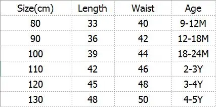 Размер (см) Длина Талия Возраст 80 33 40 9-12 м 90 36 42 12-18 м 100 39 44 18-24 м 110 42 46 От 2 до 3 лет 120 45 48 От 3 до 4 лет 130 48 50 От 4 до 5 лет