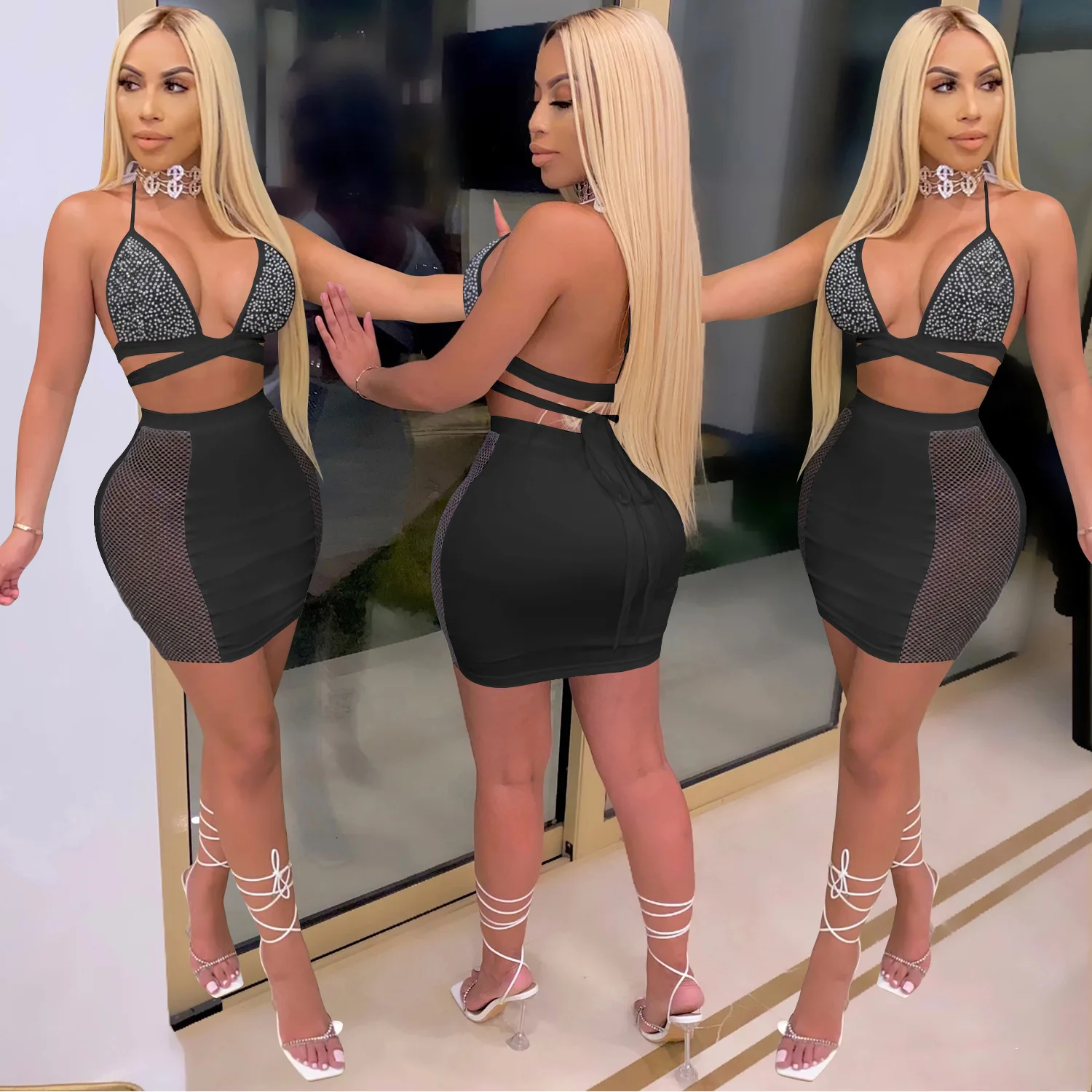 Соблазнительные соблазнительные комплекты Стразы CM.YAYA, женские соблазнительные комплекты для клувечерние из 2 предметов, короткий топ на бретелях-спагетти и юбка миди