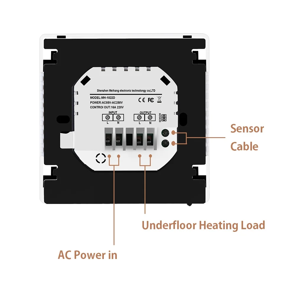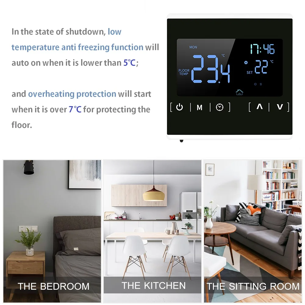 Этот цифровой термостат для подогрева пола использует усовершенствованную микрокомпьютерную микросхему управления и высокоточный датчик для контроля температуры электрических нагревательных устройств. Управляющий моторизованный шаровой клапан, моторизованный клапан, термоклапан, Соленоидный клапан, нагреватель, электрическая нагревательная пленка и Электрический нагревательный угольный кристалл. В основном используется для напольного и водяного отопления. Особенности:Термостат для нагрева сенсорного экрана, простой в установке и использовании, удобно вписывается в ваш образ жизни.Программируйте его в соответствии с вашим графиком, чтобы сократить счета за электроэнергию. Гибкие программируемые периоды: 5-2 дня или 6-1 день.В режиме выключения функция защиты от замерзания при низкой температуре автоматически включается, когда она ниже 5 ℃; А защита от перегрева начнется, когда она превышает 7 ℃ для защиты пола.Ручной режим и программируемый режим можно выбрать с помощью внешнего датчика 3 метра.6 режимов программируемой функции для управления настройкой температуры и времени. Доступны часы и минуты.Функция блокировки клавиатуры для предотвращения неправильного использования детьми.Функция памяти при сбое питания защищает ваши настройки от сбоя питания. Характеристики:Цвет: черный/белый (необязательно)Материал: Огнестойкий поликарбонат + АБС-пластикВходная частота: 60 ГцВходное напряжение: 85-250 В переменного токаДатчик температуры: термометр NTCТочность контроля температуры: ± 1 ℃Потребляемая мощность: <1 ВтТок нагрузки: 16 АКлюч: сенсорное управлениеНастройка температуры: от 5 до 50 ℃Диапазон измерения температуры: -9 ℃ ~ 99 ℃Дисплей: 71*40 мм ЖК-дисплейРасстояние между монтажными отверстиями: 60 ммПодходящий размер проволочной коробки: 86*86 ммРазмер изделия: прибл. 86*86*45 мм/3,4*3,4 * 1.77inВес изделия: прибл. 135 г/4,8 унцийРазмер посылка: прибл. 10,4*10*8 см/4,1*3,9 * 3.1inВес посылка: прибл. 277 г/9,8 унций Упаковочный лист:1 * термостат для подогрева пола1*3 м кабель внешнего датчика2 крепежных винта1 * Руководство пользователя (на английском и русском языках) Примечание:Для установки термостата необходимо подготовить распределительную коробку на стену, подходящий размер 86*86 мм. А расстояние установки составляет 60 мм.