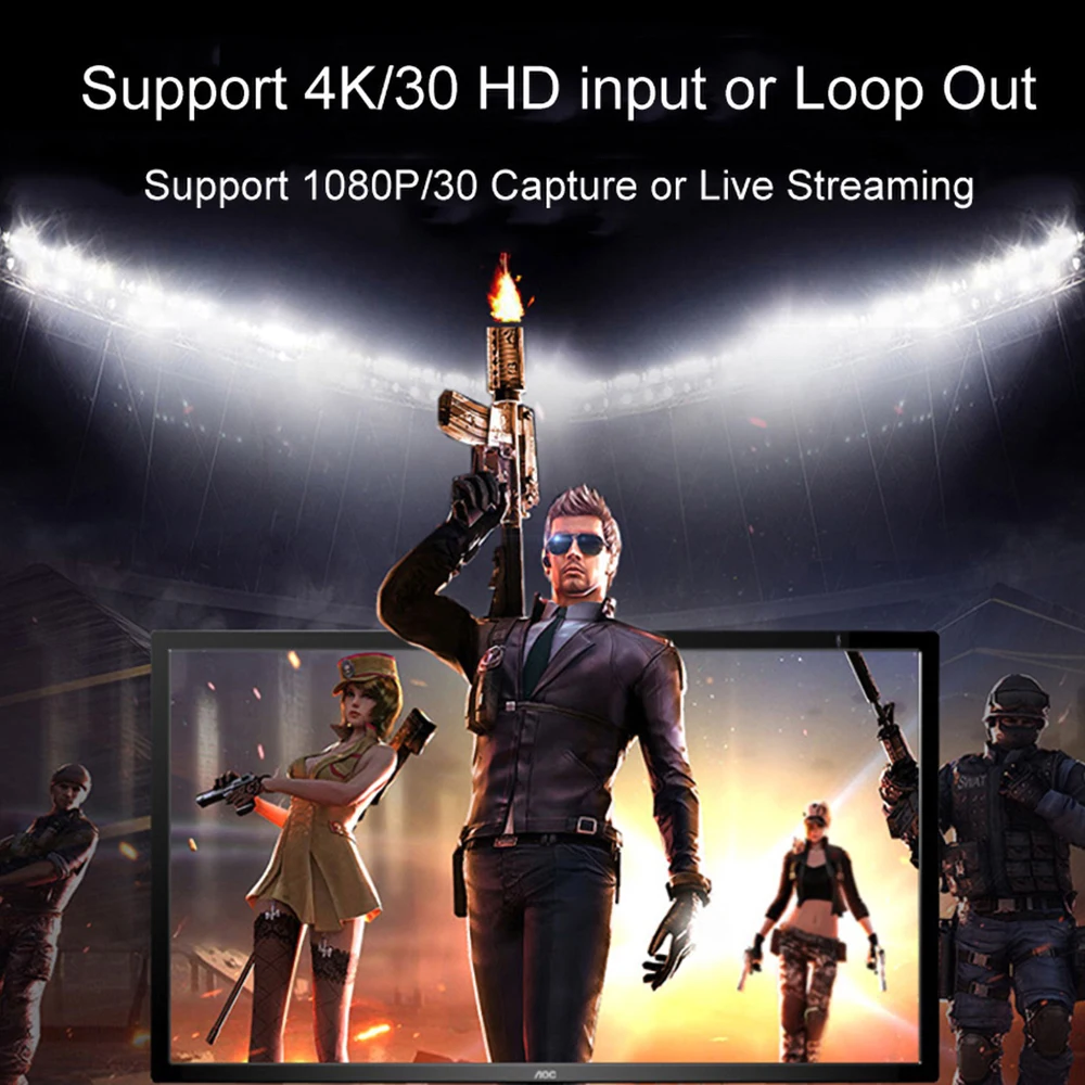 Карта видеозахвата 4K USB 2,0 с циклическим выходом, коробка для записи видео для ПК, игр, прямой трансляции, видео, записывающее устройство с микрофоном и аудиовыходом