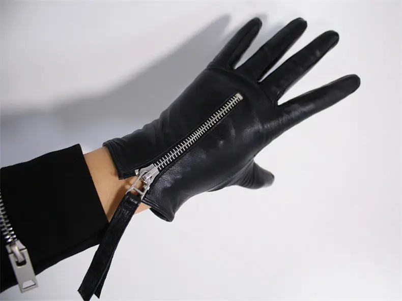 Перчатки из натуральной кожи с сенсорным экраном 21 см, Короткая секция из чистой импортной козьей кожи, яркие черные женские на ощупь, серебристая молния WZP10