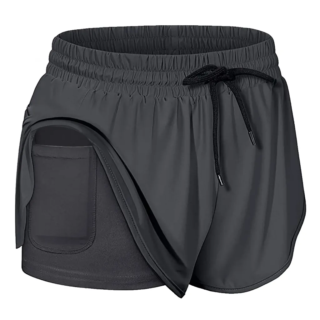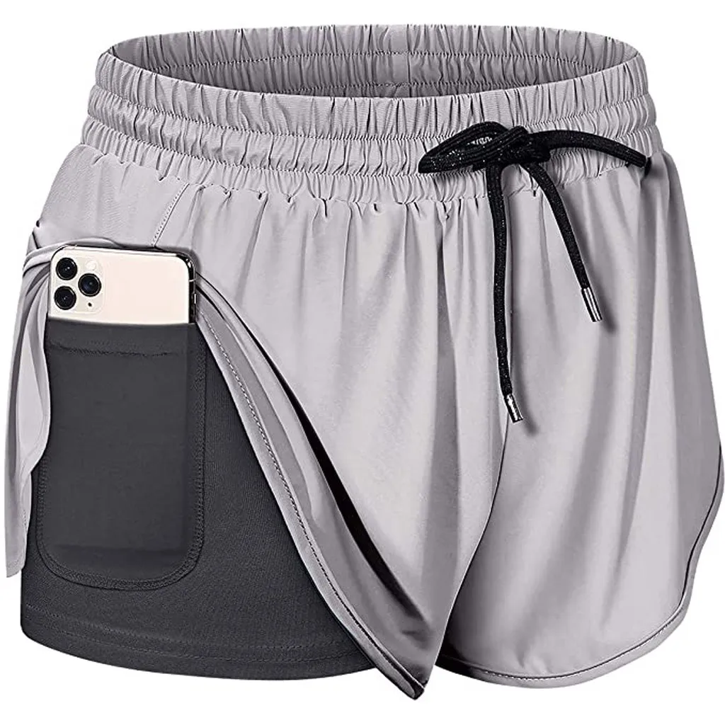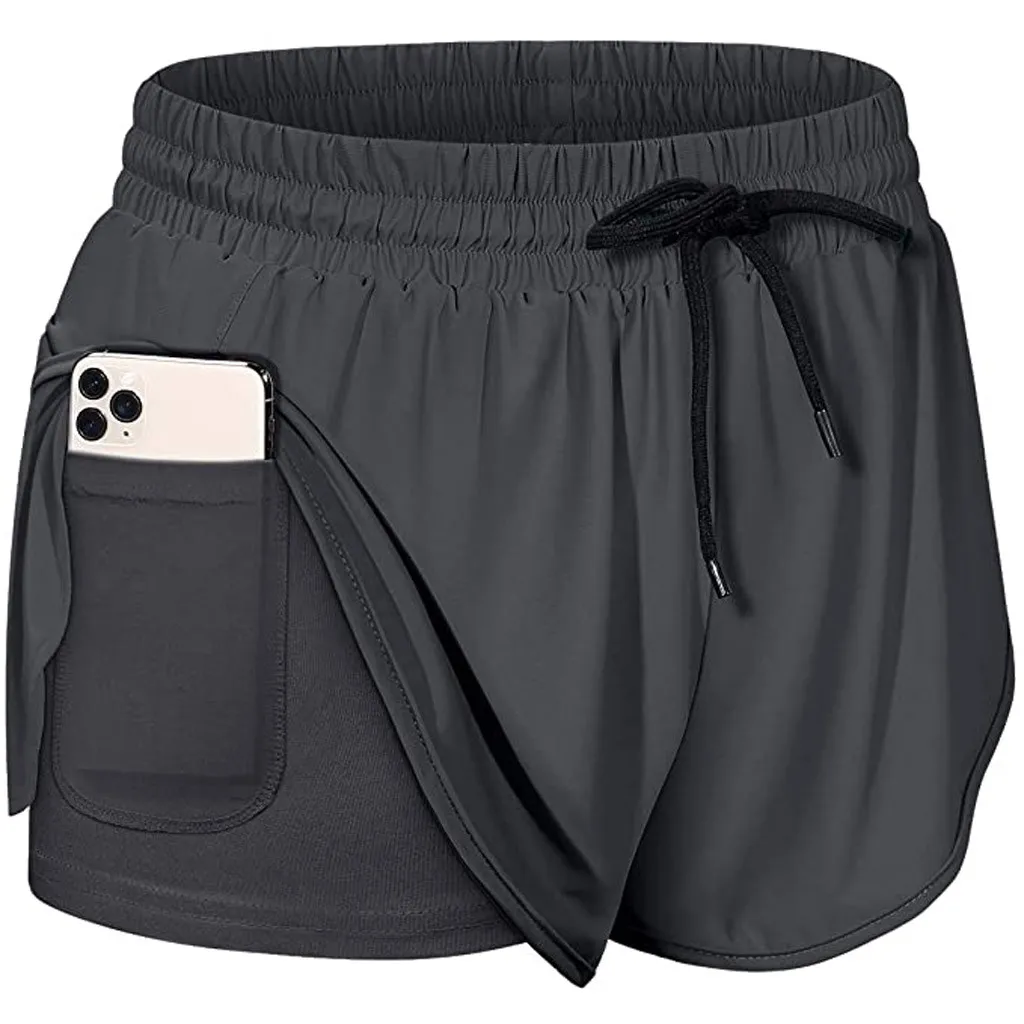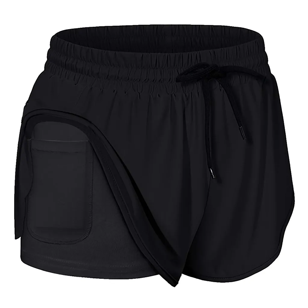 Шорты женские быстросохнущие с высокой талией, спортивные, для занятий йогой, бега, двухслойные, для фитнеса, тренировок, с карманом для телефона