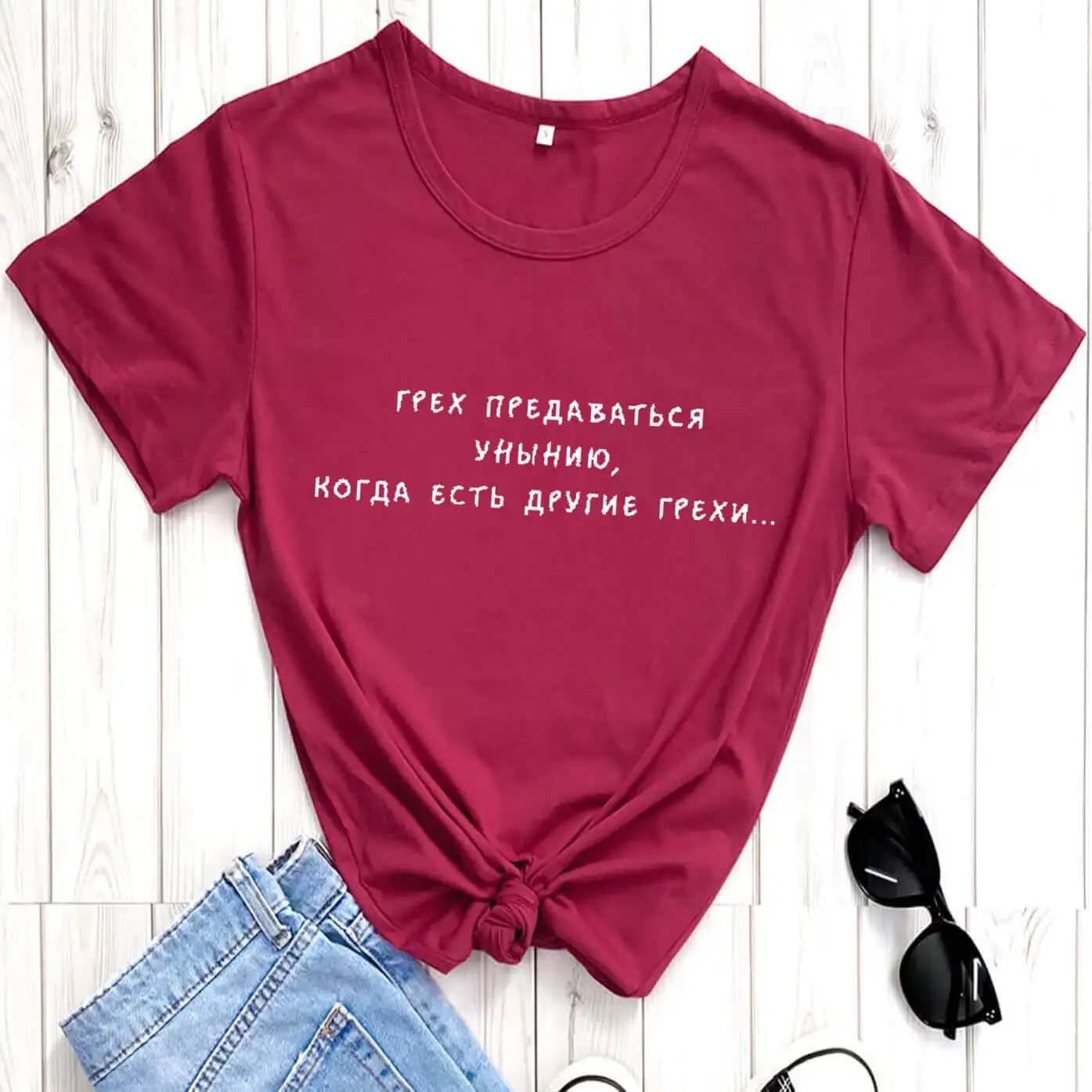 Грех предаваться унынию Летняя женская футболка, топы с надписью Русская ,женские футболки, хипстерские футболки Tumblr, Новое поступление, летняя рубашка