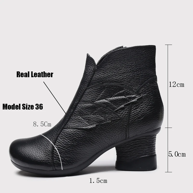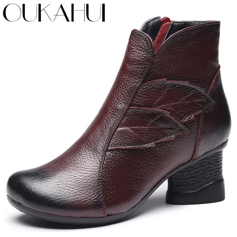 OUKAHUI винтажные осенние ботильоны из натуральной кожи с украшением листьев для женщин на среднем каблуке женские короткие зимние ботинки на молнии на массивном каблуке
