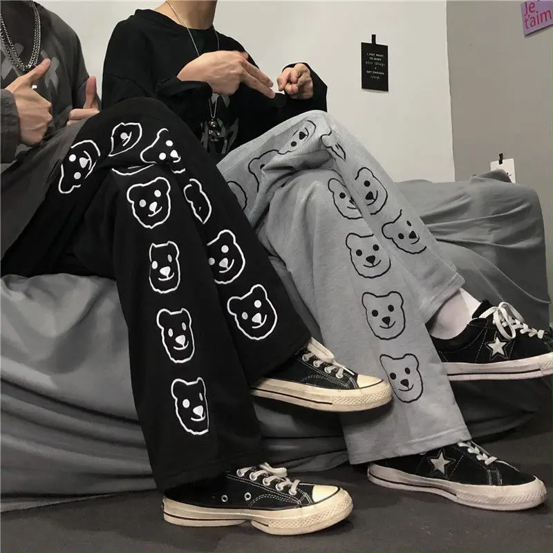 Осенние женские прямые брюки с высокой талией, повседневные брюки с принтом медведя, уличная одежда для женщин, черные свободные милые женские брюки в стиле хип-хоп