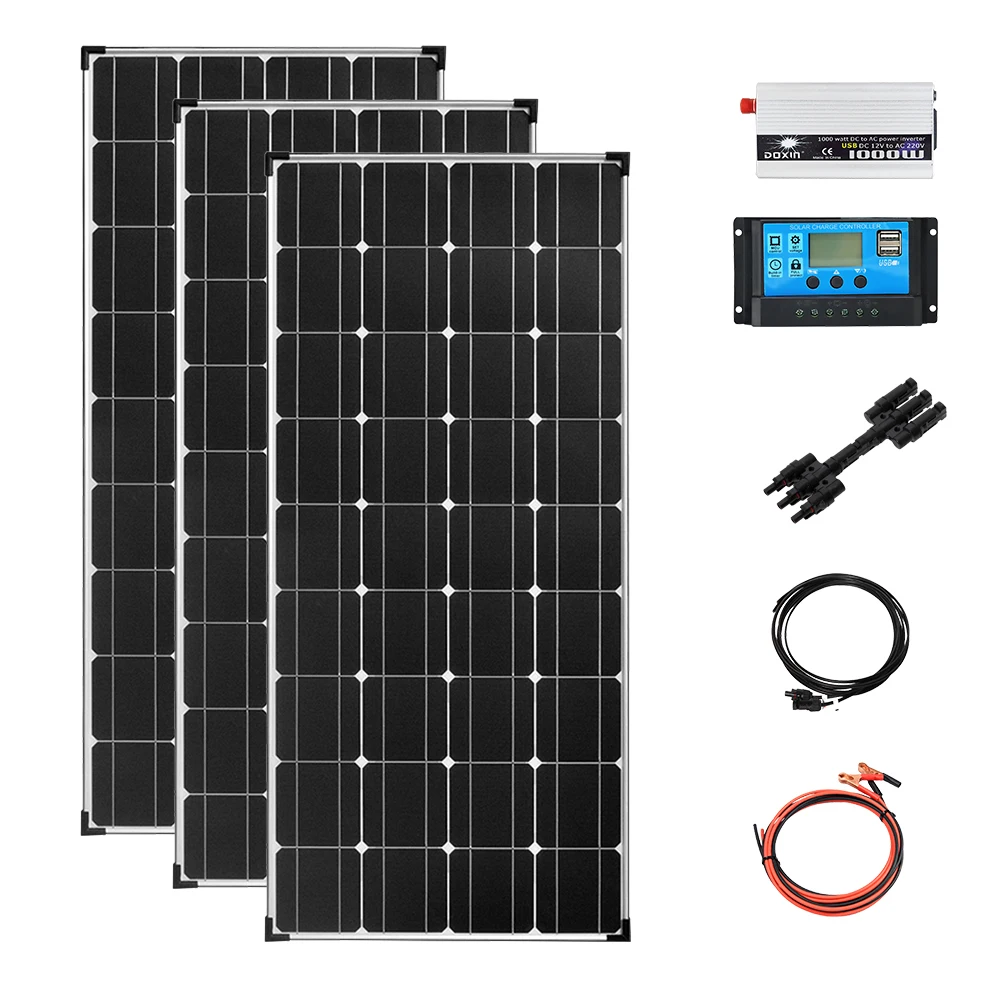 Солнечная панель 3*120 Вт1*12 В/24 В 30 А контроллерЗажимы типа Крокодил 1*3 метра1*3 м pv кабельАдаптер 1*3 в 1Инвертор 1*12 В 220 В 1000 Вт